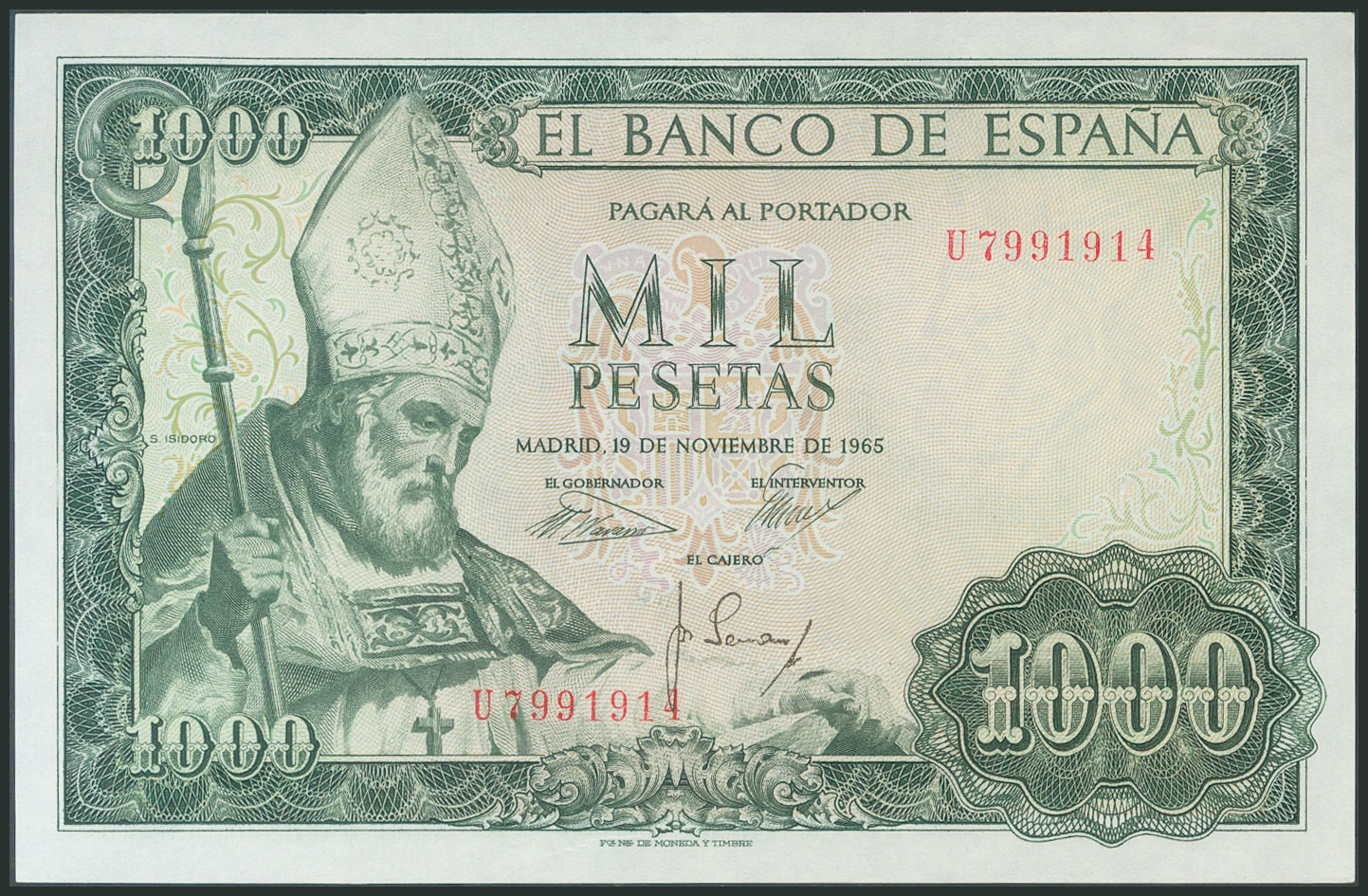 1000 Pesetas. 19 de Noviembre de 1965. Serie U. (Edifil 2017: 471b). Conserva todo su apresto original. SC-.