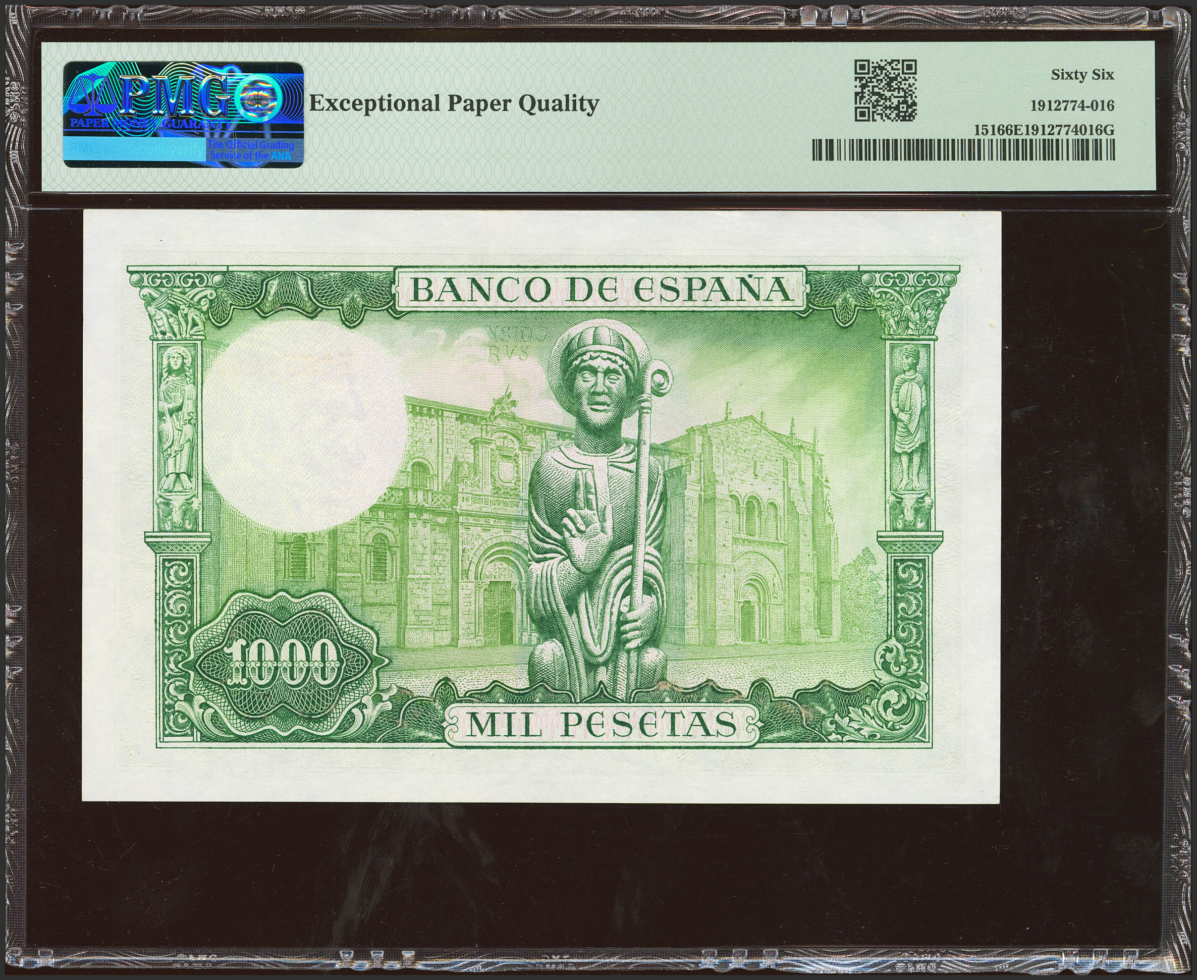 1000 Pesetas. 19 de Noviembre de 1965. Serie Y. (Edifil 2021: 471b, Pick: 151). Muy raro en esta excepcional calidad, apresto original. SC. Encapsulado PMG66EPQ.