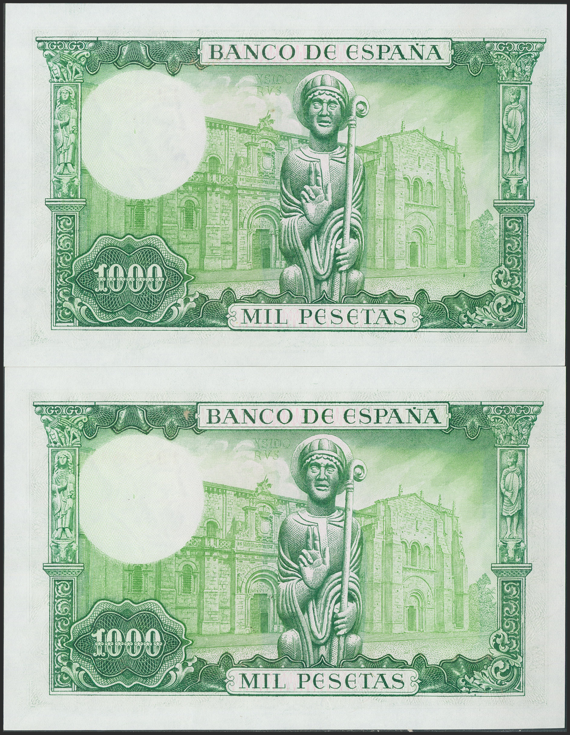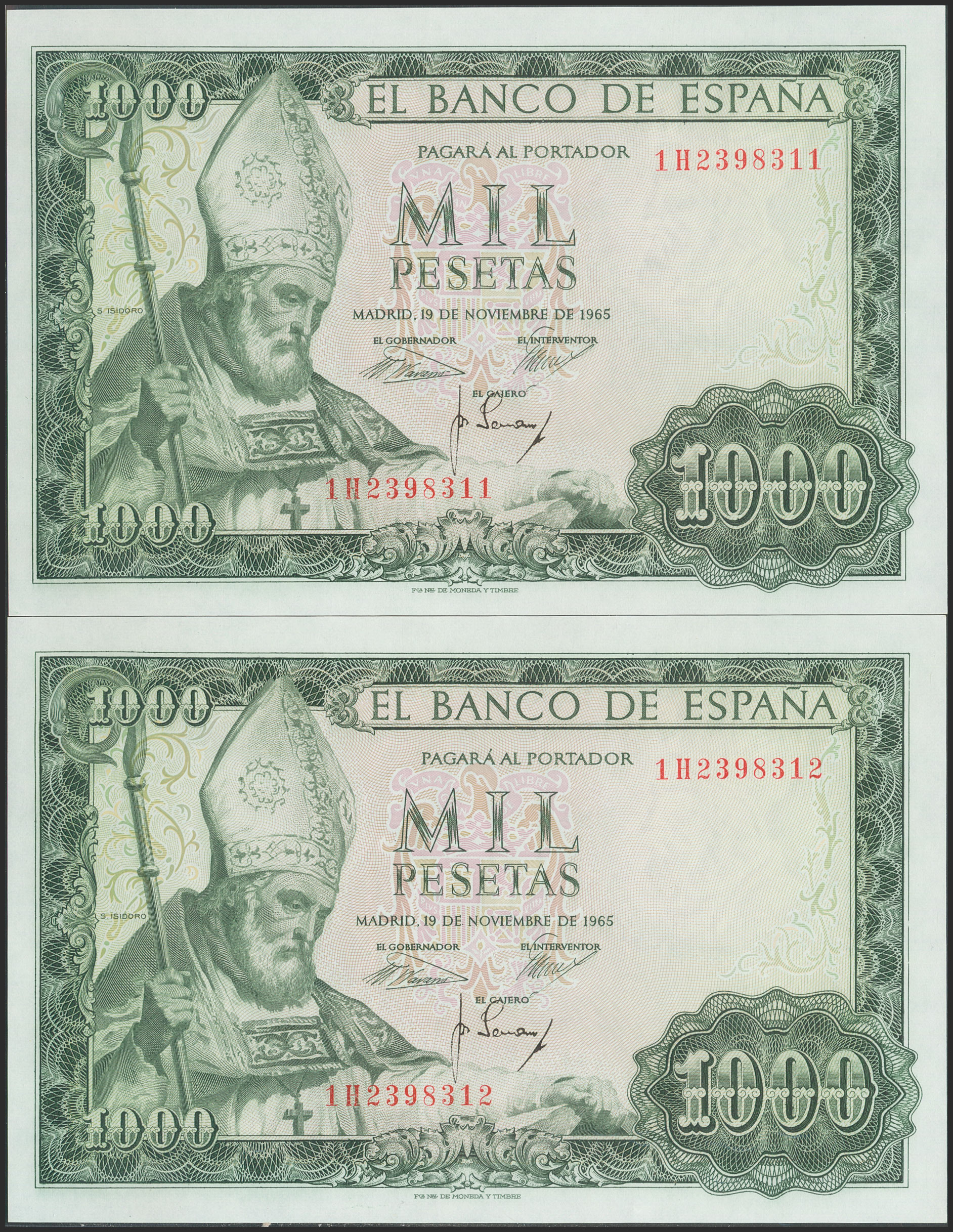 1000 Pesetas. 19 de Noviembre de 1965. Pareja correlativa. Serie 1H. (Edifil 2021: 471b). Apresto original. SC/SC-.
