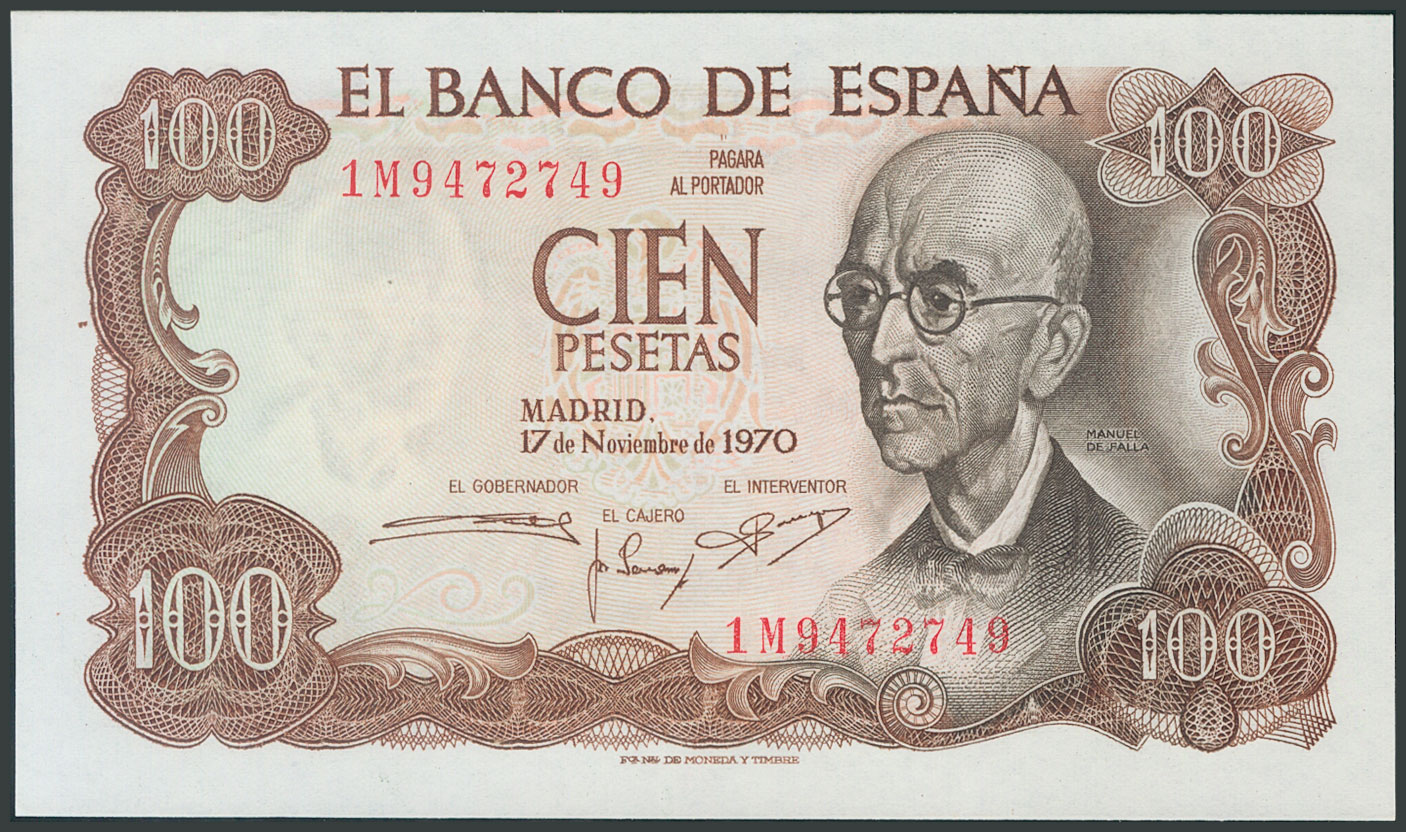 100 Pesetas. 17 de Noviembre de 1970. Serie 1M y numeración capicúa. (Edifil 2017: 472c). SC.