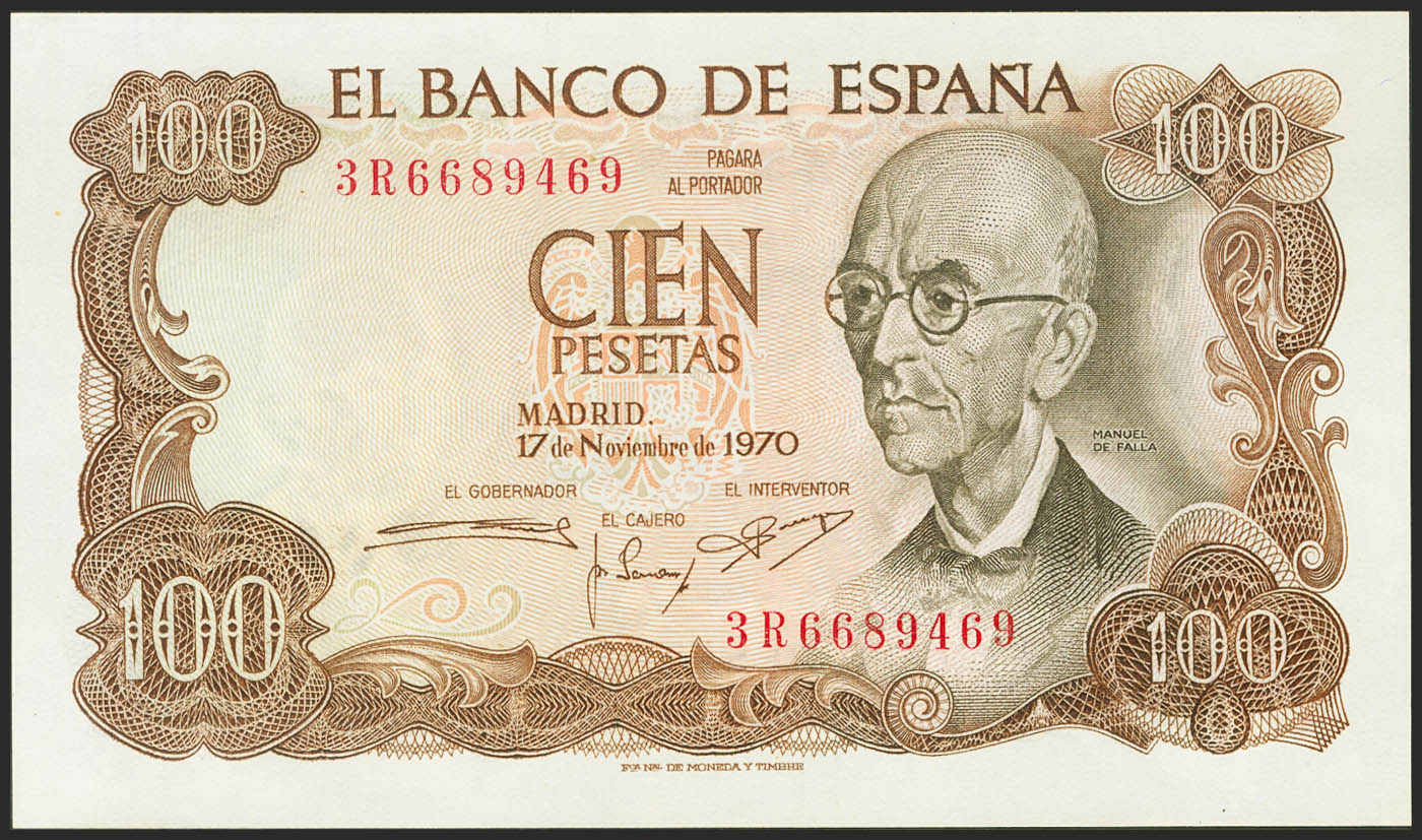 100 Pesetas. 17 de Noviembre de 1970. Serie 3R. (Edifil 2021: 472c). Conserva todo su apresto original. SC-.