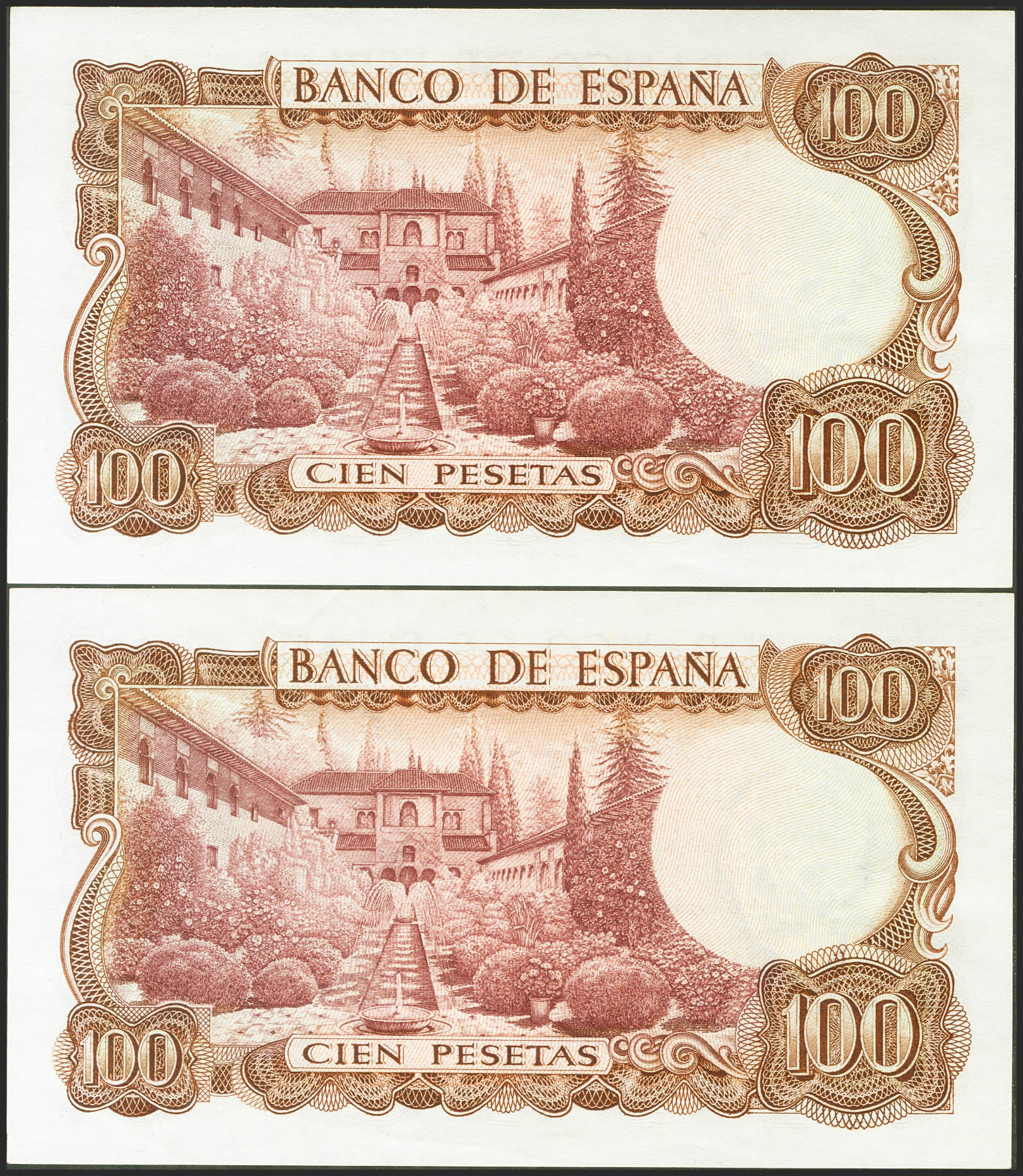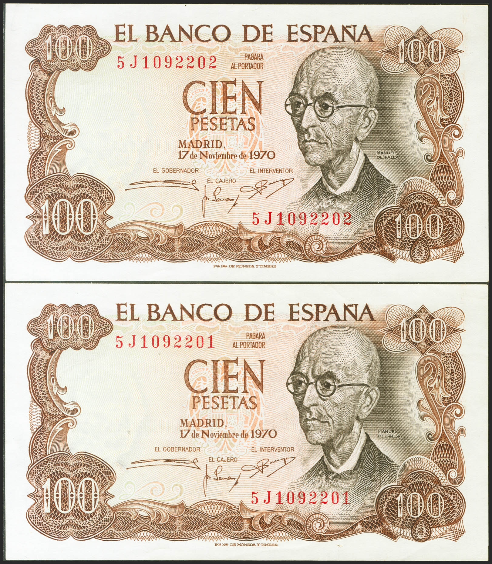 100 Pesetas. 17 de Noviembre de 1970. Pareja correlativa. Serie 5J. (Edifil 2021: 472c). Apresto original. EBC+.