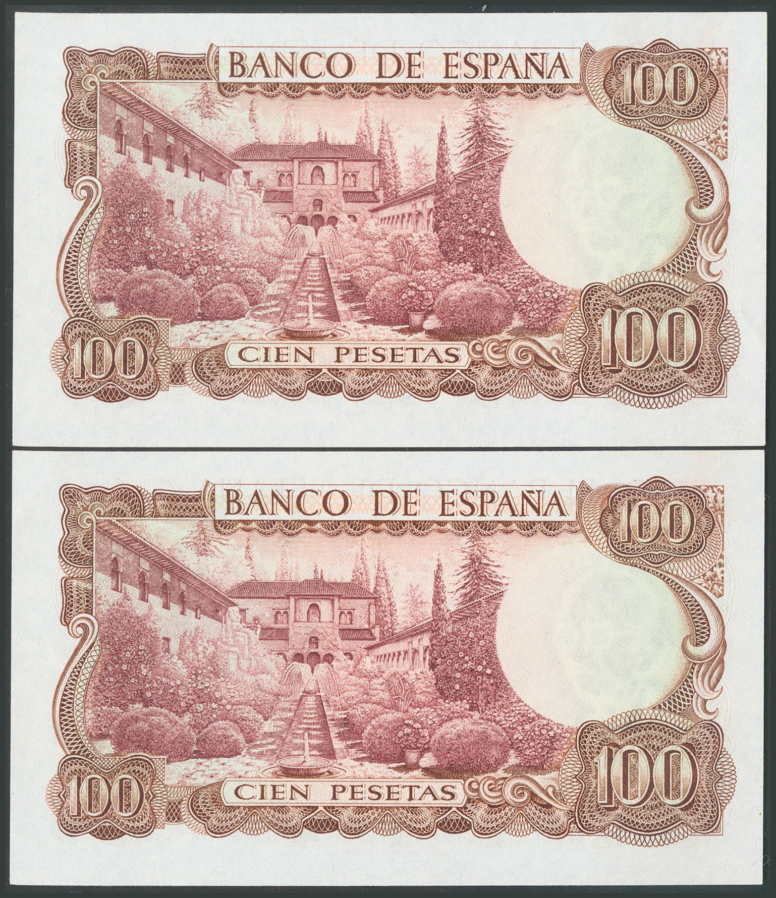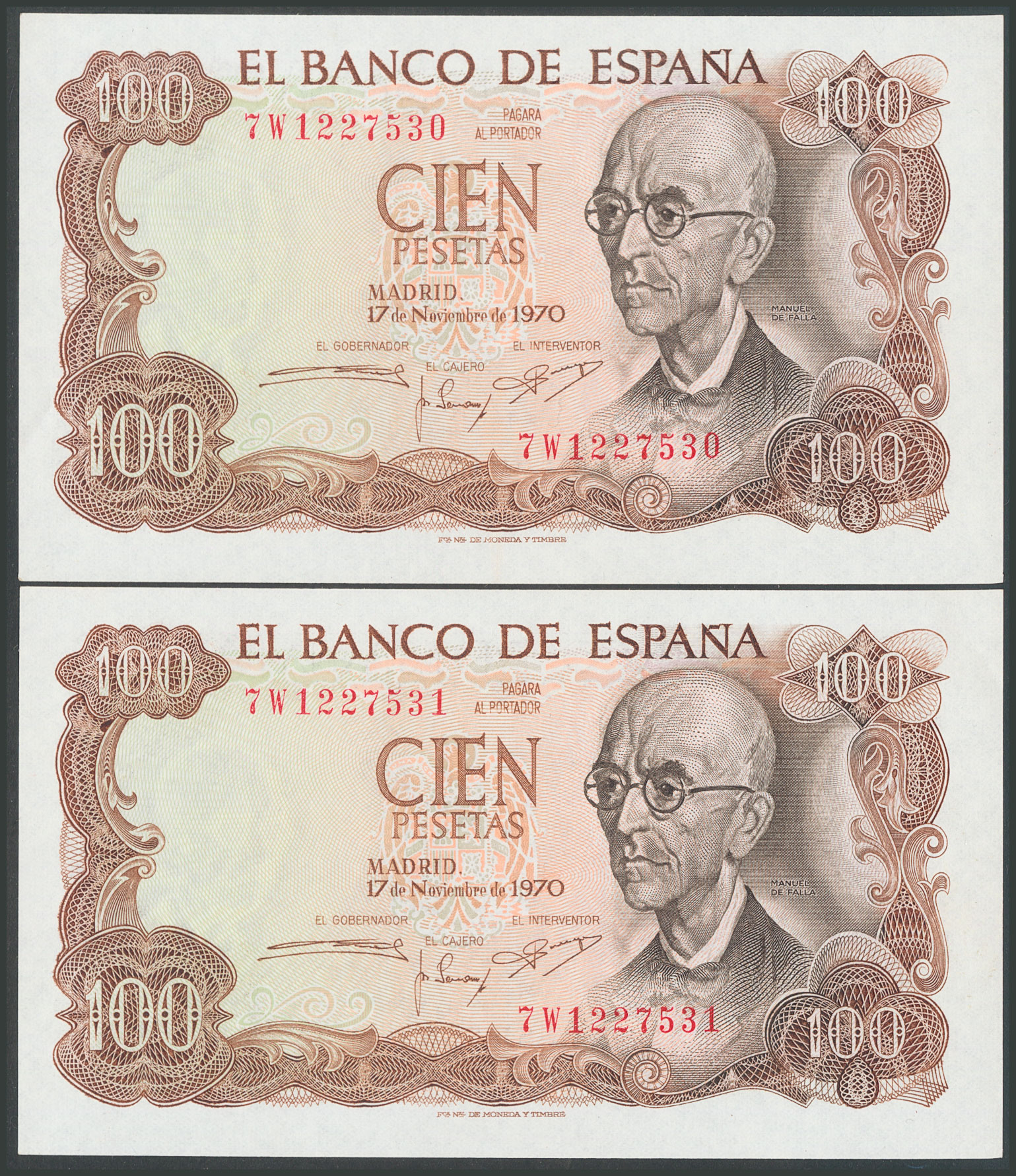 100 Pesetas. 17 de Noviembre de 1970. Pareja correlativa. Serie 7W, última serie emitida. (Edifil 2017: 472c). SC.