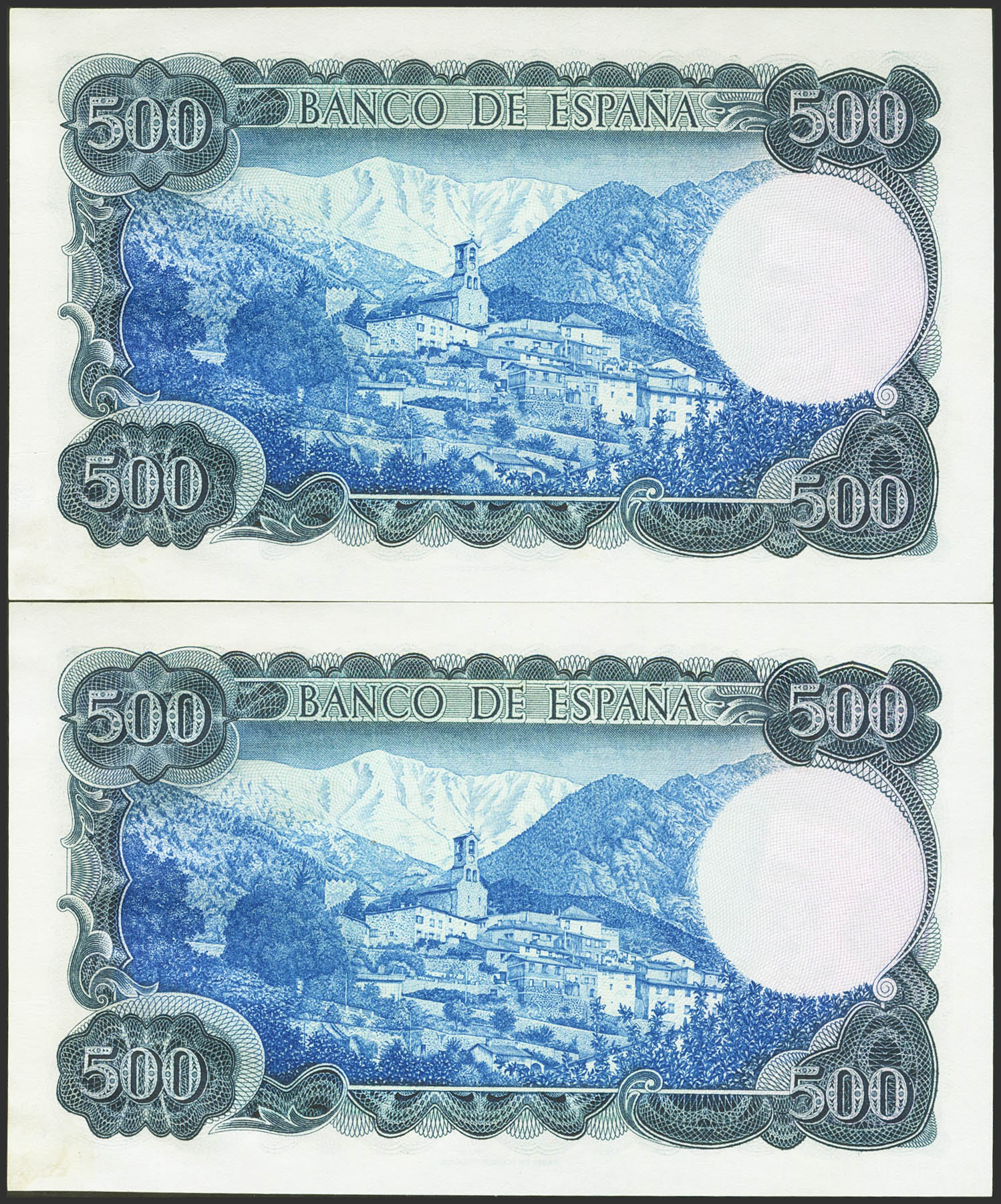 500 Pesetas. 23 de Julio de 1971. Pareja correlativa. Serie R. (Edifil 2023: 473a). Conserva todo su apresto original. SC-.
