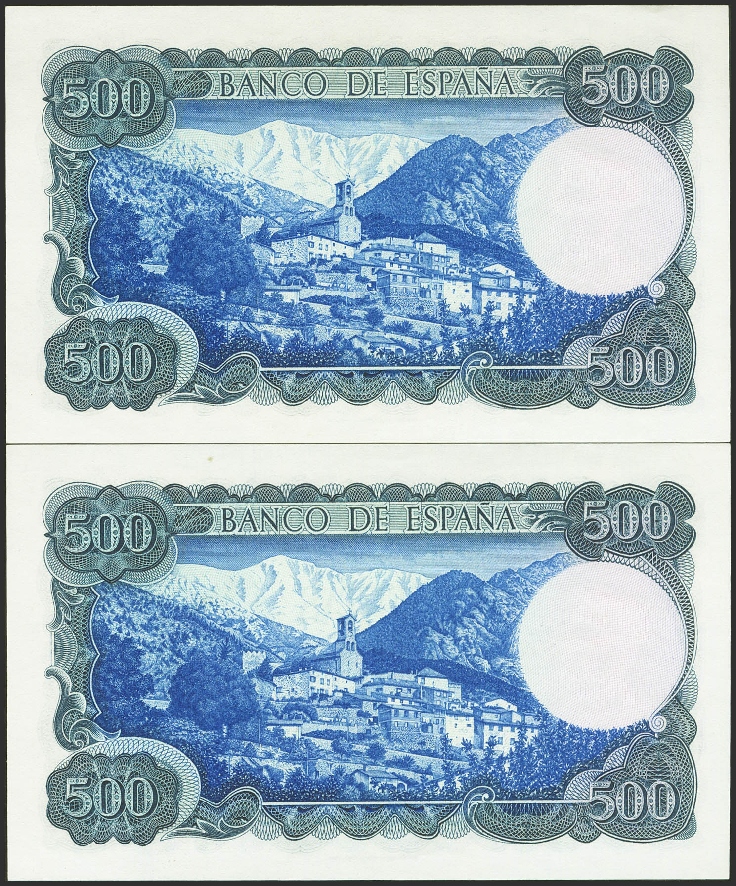 500 Pesetas. 23 de Julio de 1971. Pareja correlativa. Serie Y. (Edifil 2023: 473a). Conserva todo su apresto original. SC-.