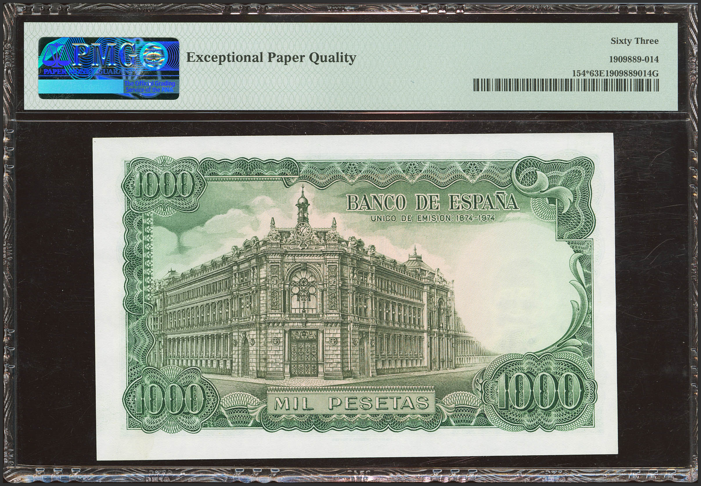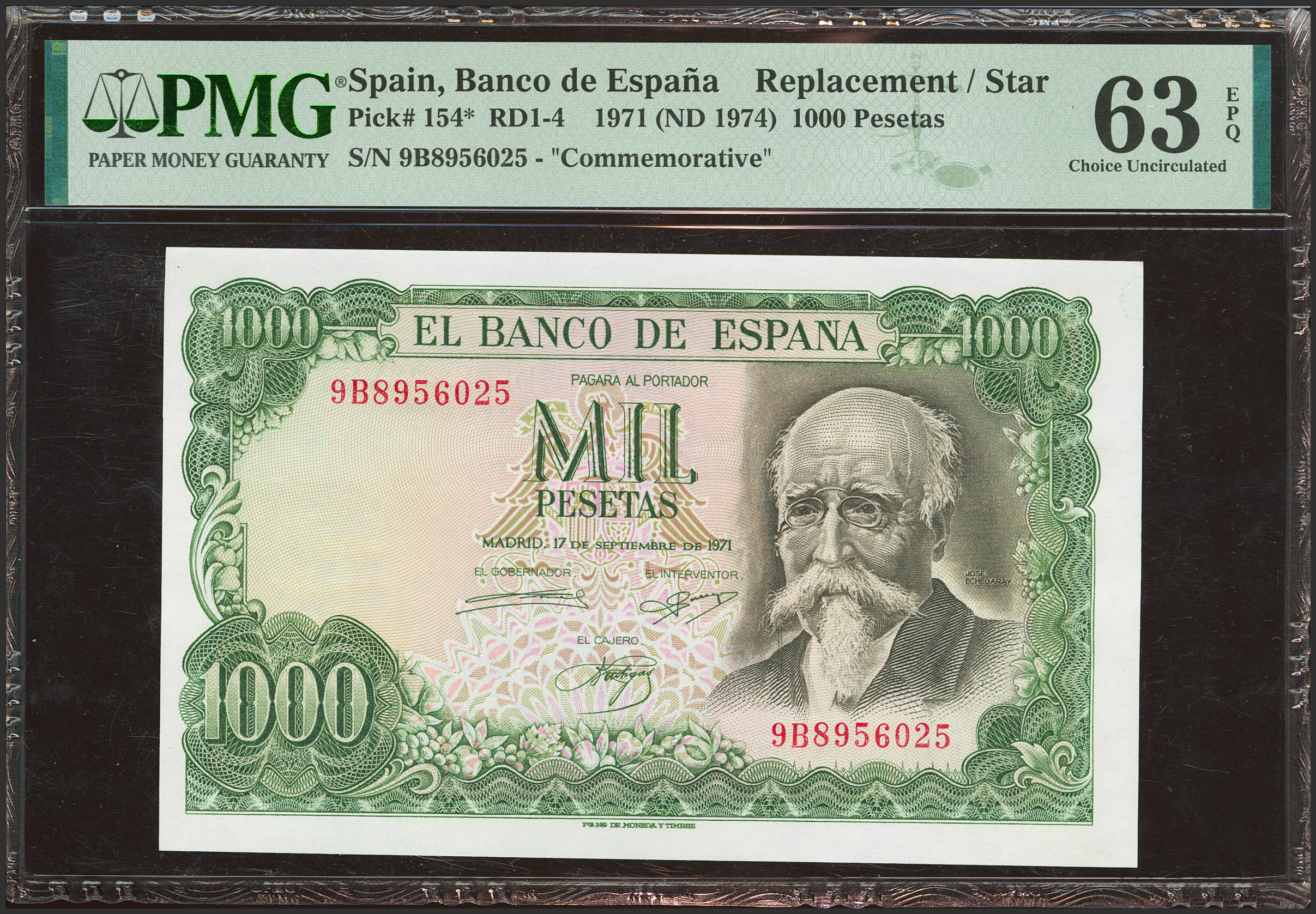 1000 Pesetas. 17 de Septiembre de 1971. Serie especial 9B. (Edifil 2021: 474d, Pick: 154*). Rara serie, apresto original. SC. Encapsulado PMG63EPQ.