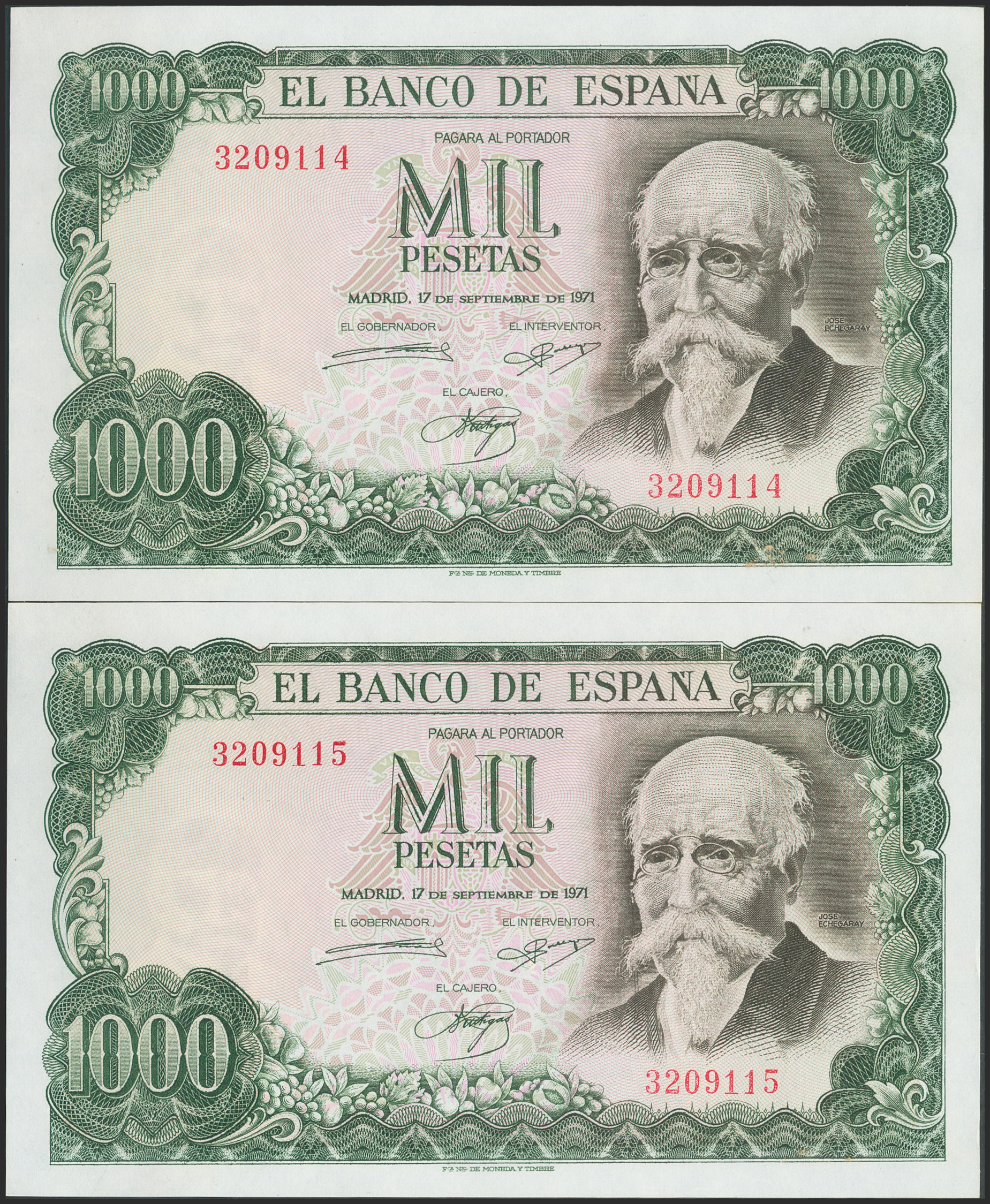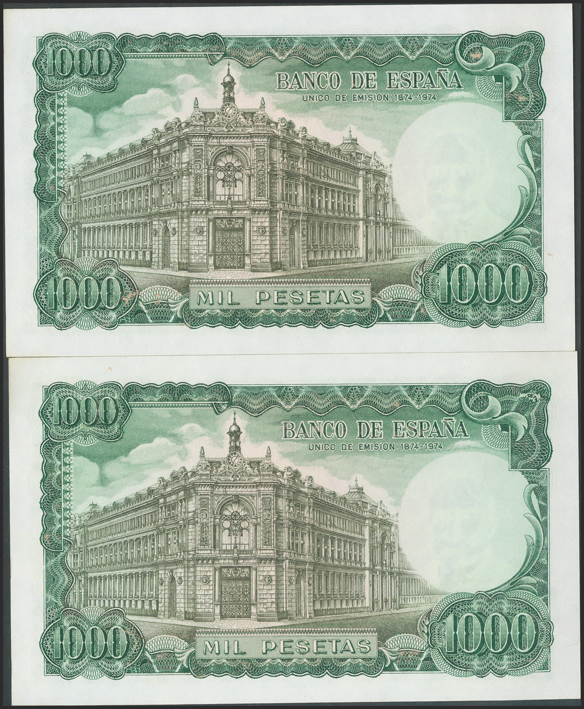 1000 Pesetas. 17 de Septiembre de 1971. Pareja correlativa. Sin serie. (Edifil 2017: 474). Apresto original. SC-.