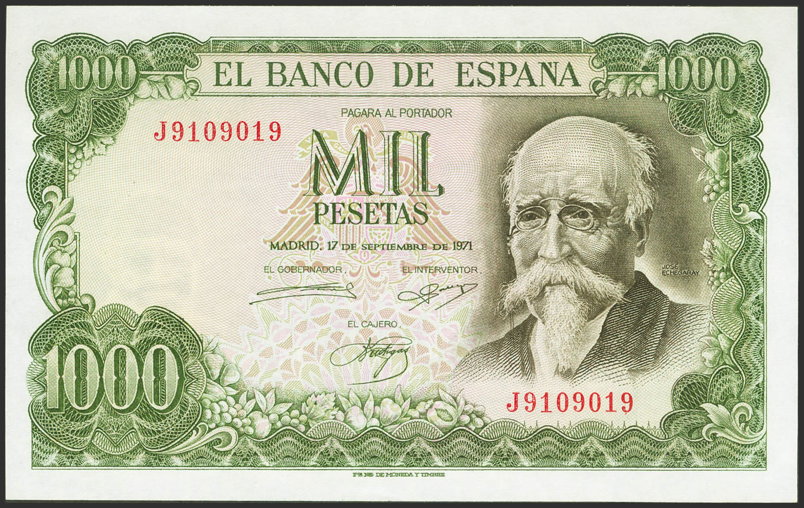1000 Pesetas. 17 de Septiembre de 1971. Serie J y numeración capicúa. (Edifil 2021: 474c). Apresto original. SC.