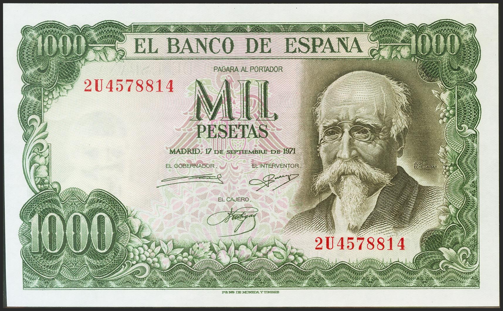 1000 Pesetas. 17 de Septiembre de 1971. Serie 2U. (Edifil 2021: 474c). Apresto original. SC.