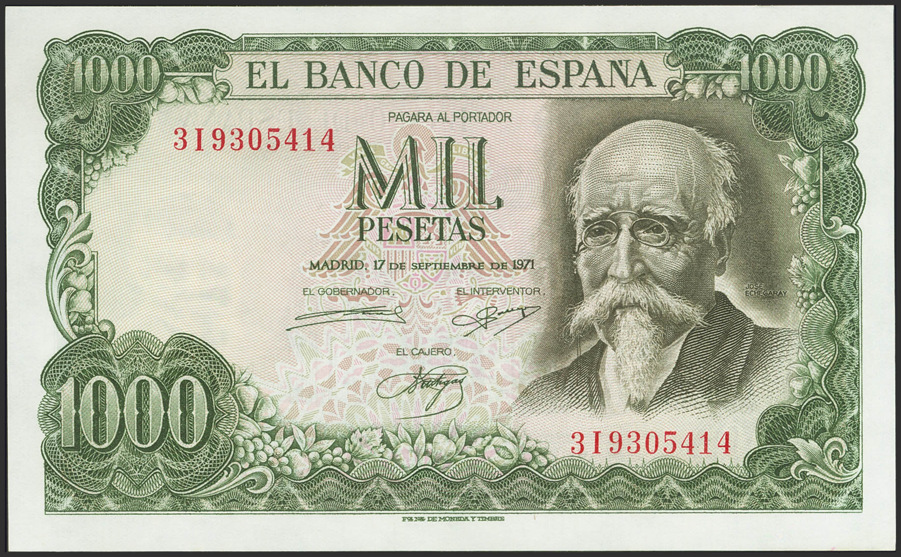 1000 Pesetas. 17 de Septiembre de 1971. Serie 3I. (Edifil 2023: 474c). Apresto original. SC.
