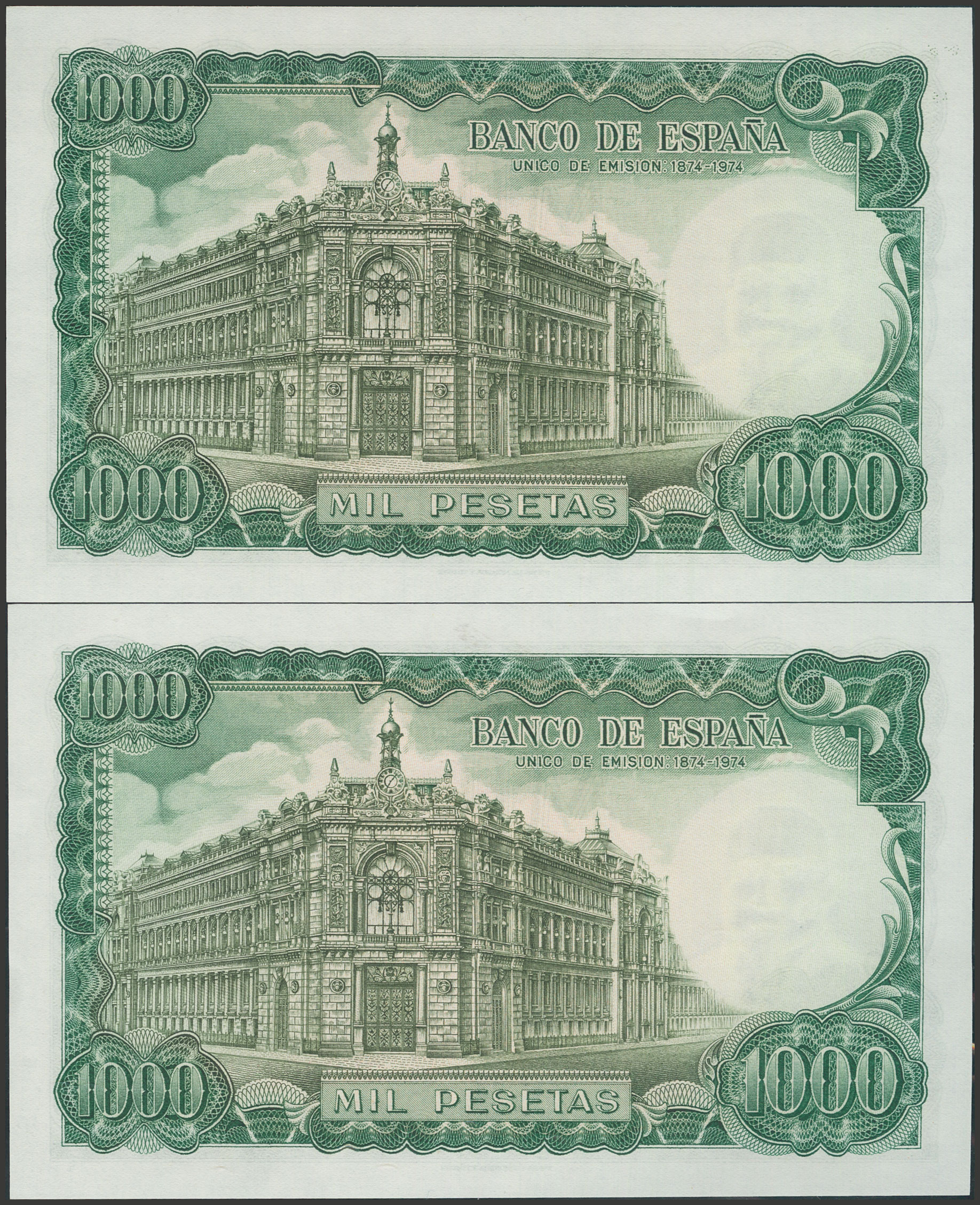 1000 Pesetas. 17 de Septiembre de 1971. Pareja correlativa. Serie 3U. (Edifil 2017: 474c). Apresto original. SC.