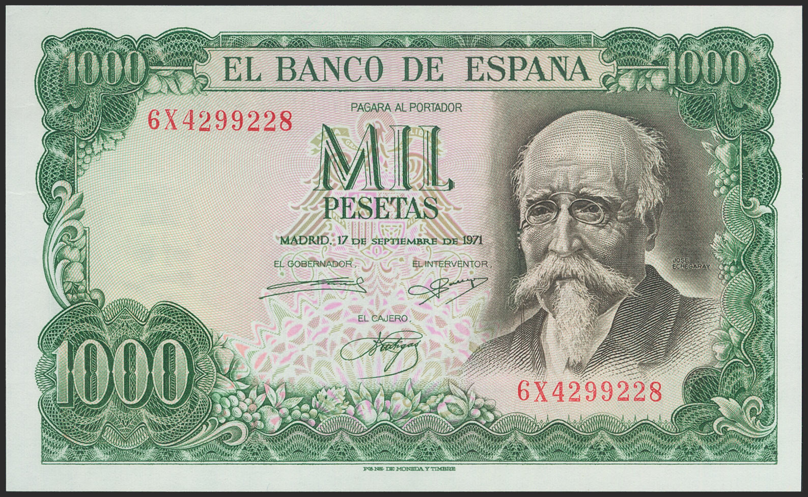 1000 Pesetas. 17 de Septiembre de 1971. Serie 6X. (Edifil 2021: 474c). Apresto original. SC.