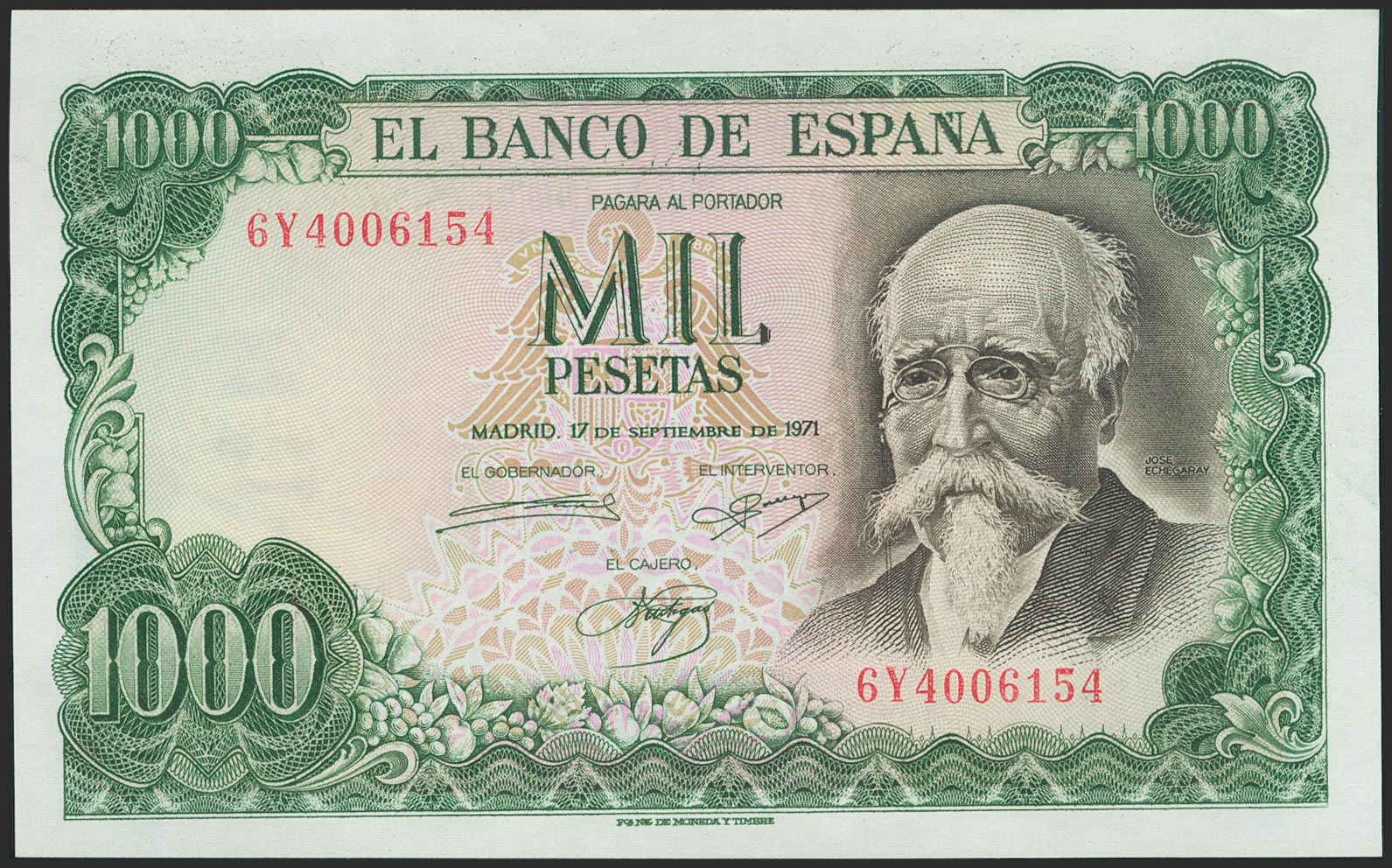 1000 Pesetas. 17 de Septiembre de 1971. Serie 6Y. (Edifil 2021: 474c). Apresto original. SC.