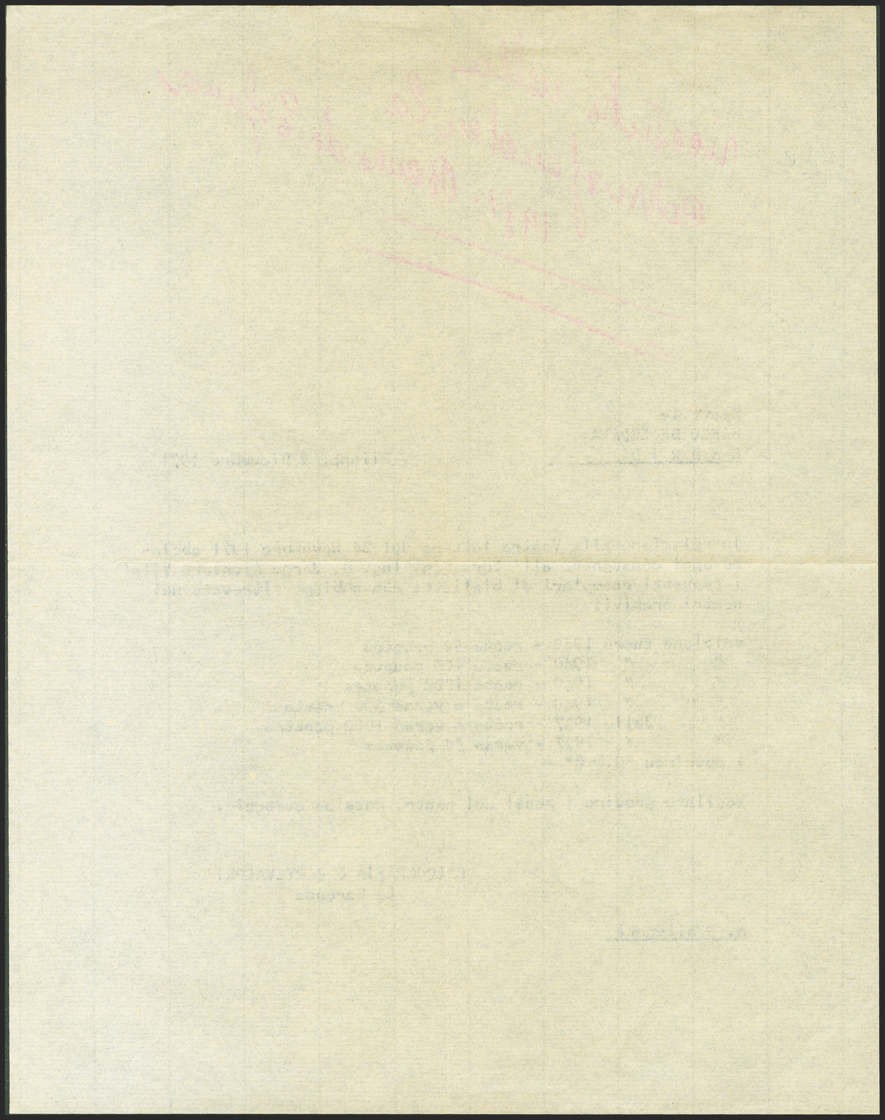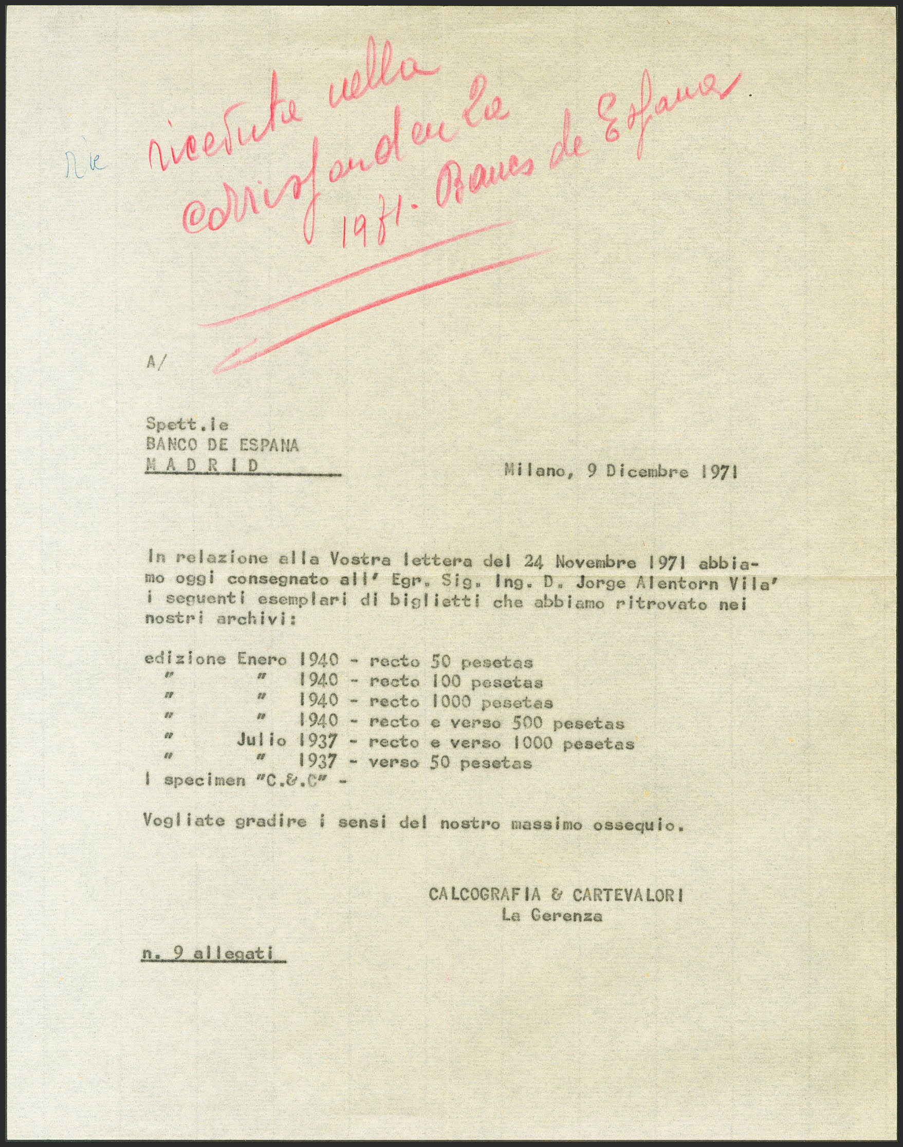 Esta carta fue enviada por la gerencia de Calcografia & Cartevalori al Banco de España el 9 de Diciembre de 1971, hacia los días finales de la imprenta italiana antes de ser absorbida por Metrotipo. Hace referencia a una comunicación de apenas un par de semanas antes, en la que el Banco de España habría solicitado en nombre de Jorge Alentorn Vilá ejemplares de archivo, muy probablemente para la confección del “Catálogo de papel moneda español”, que publicó en 1974 junto con Florián Ruiz Vélez-Frías.