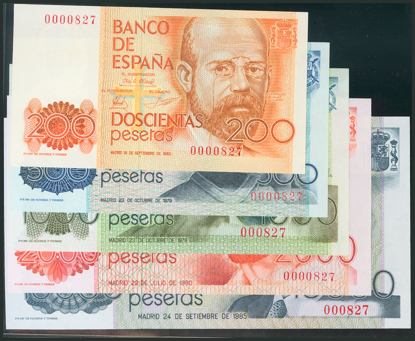 Conjunto de 5 billetes del Banco de España de 200 Pesetas, 500 Pesetas, 1000 Pesetas, 2000 Pesetas y 10000 Pesetas, todos los billetes emitidos entre 1979 y 1985 (a excepción del de 5000 Pesetas, que precisamente el catálogo Edifil no lo incorpora como serie completa), todos sin serie y con la misma numeración baja 0000827. (Edifil 2017: 480, 476, 477, 479, 481). SC/SC-.