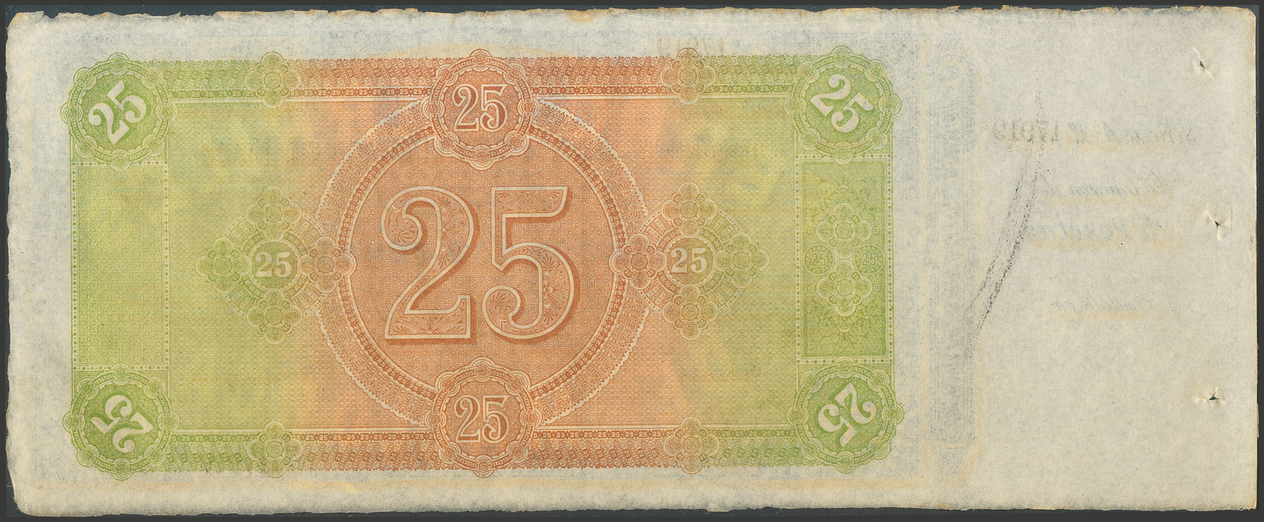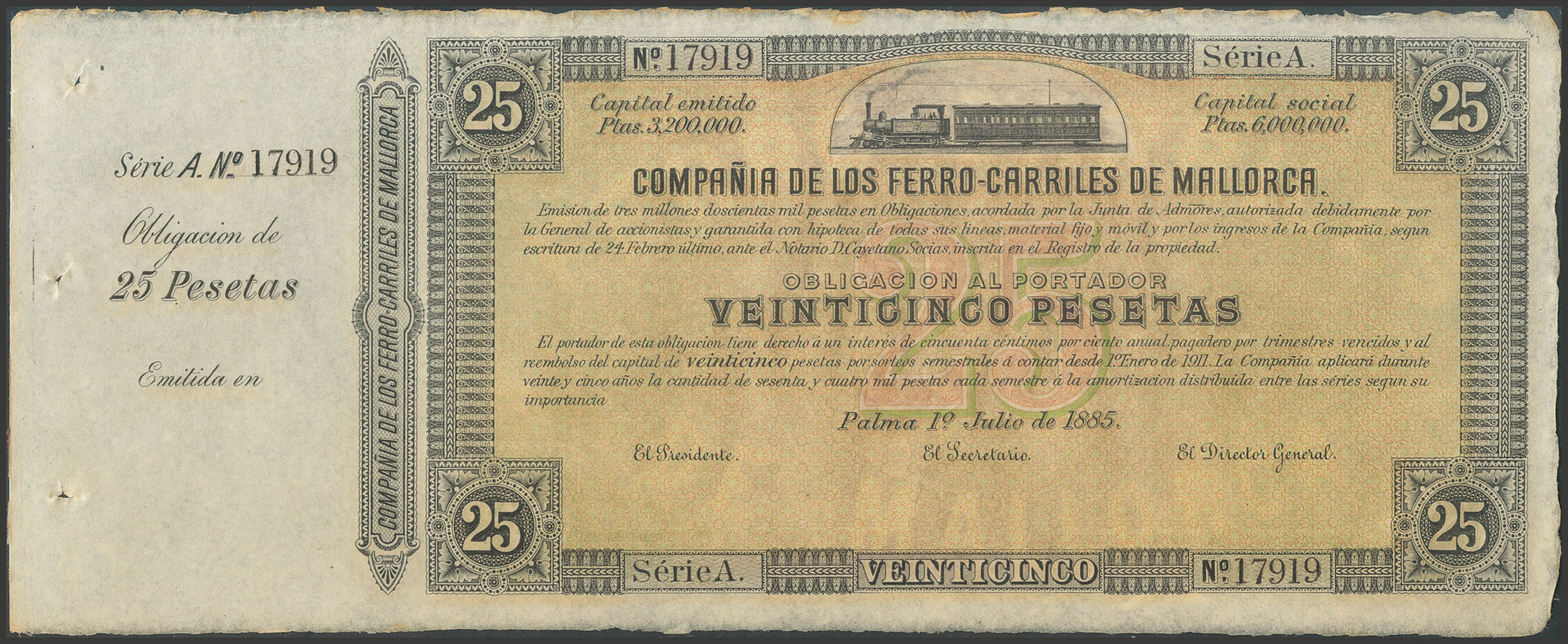 25 Pesetas (obligación utilizada como papel moneda). 1 de Julio de 1885. Serie A y matriz a la izquierda. Inusual. SC-.