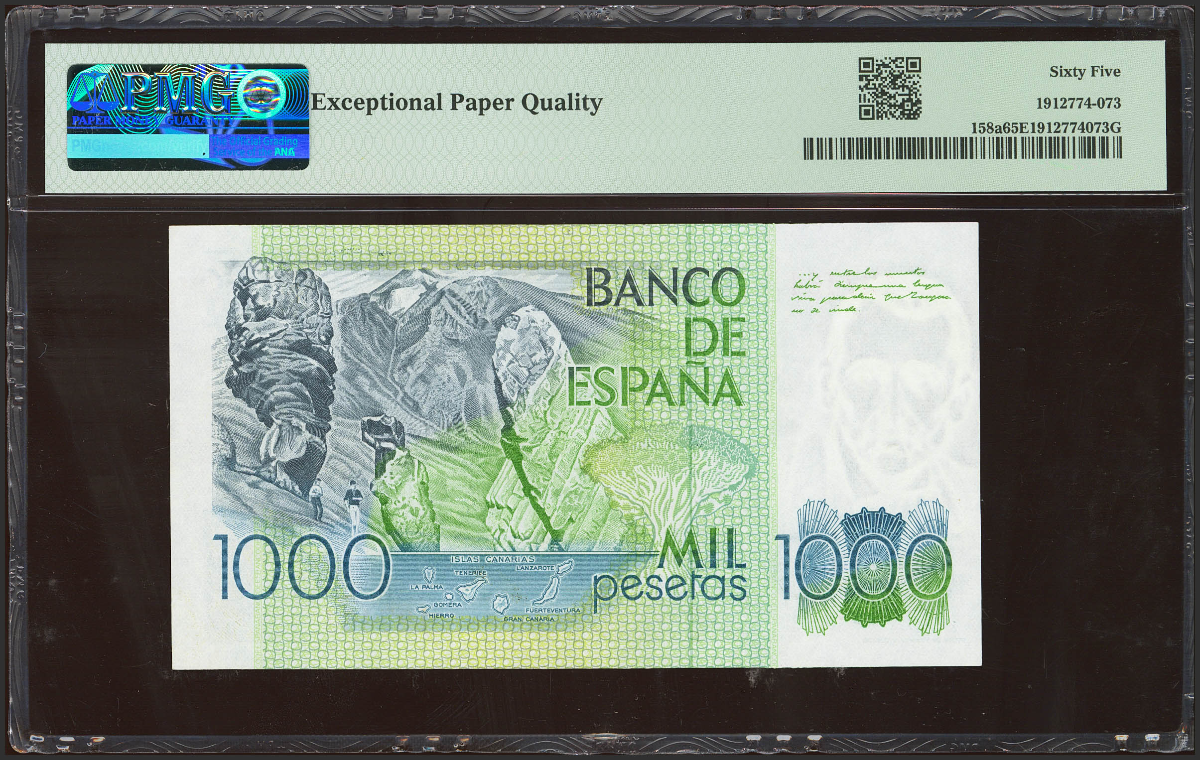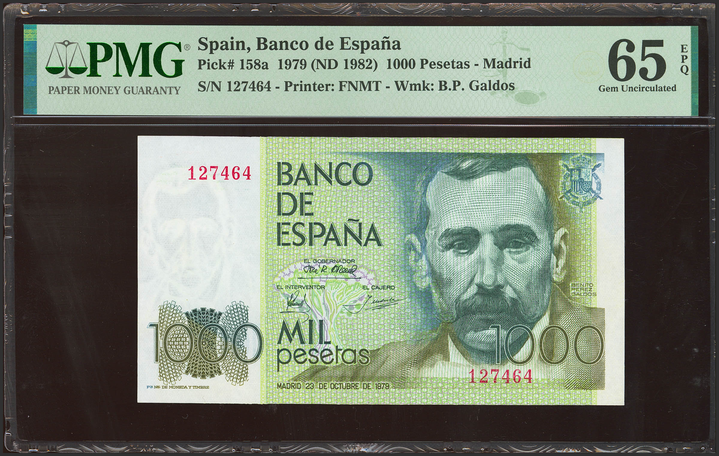 1000 Pesetas. 23 de Octubre de 1979. Sin serie. (Edifil 2021: 477, Pick: 158a). Inusual en esta excepcional calidad. SC. Encapsulado PMG65EPQ.