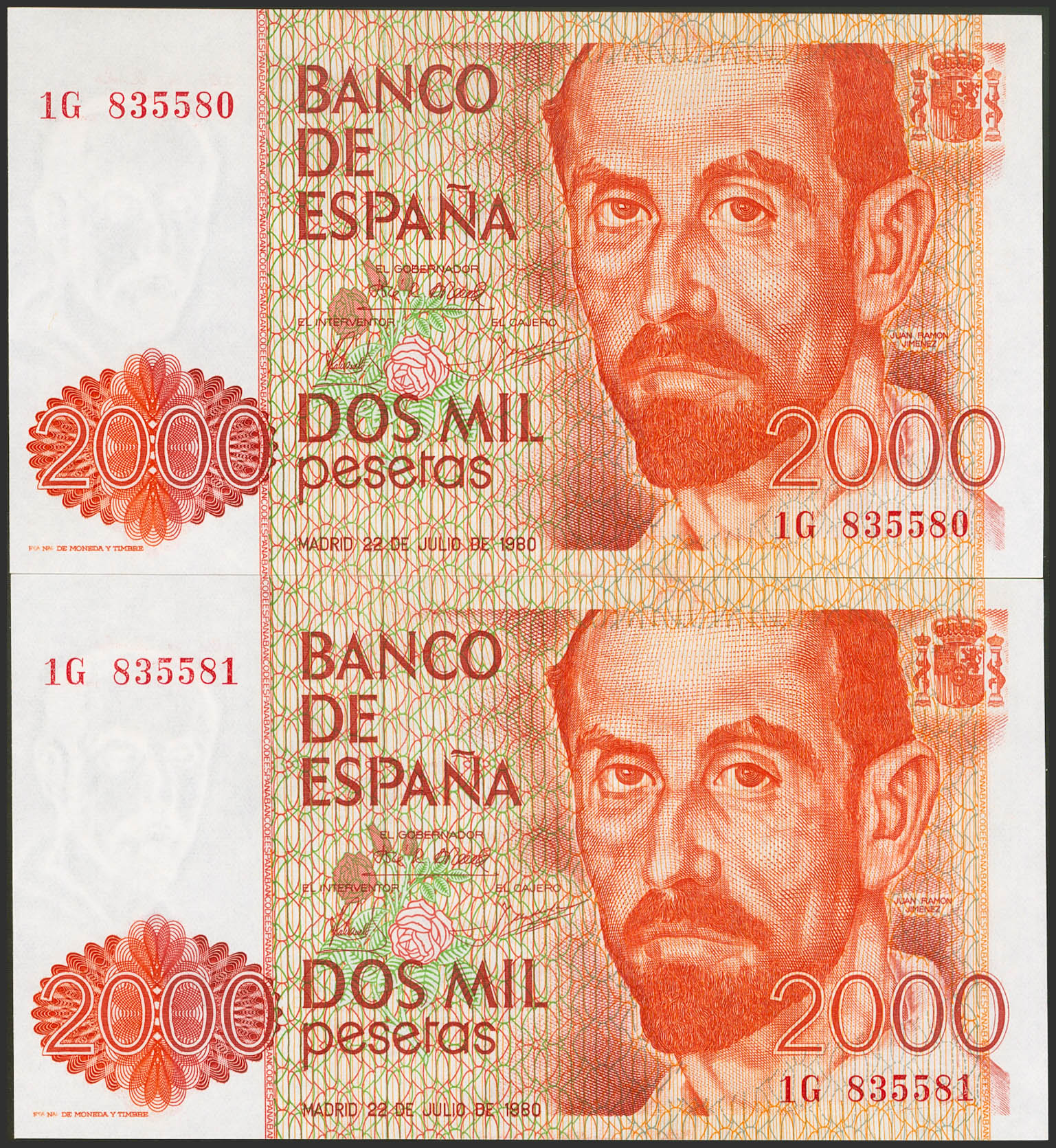 2000 Pesetas. 22 de Julio de 1980. Pareja correlativa. Serie 1G. (Edifil 2023: 479a). SC.