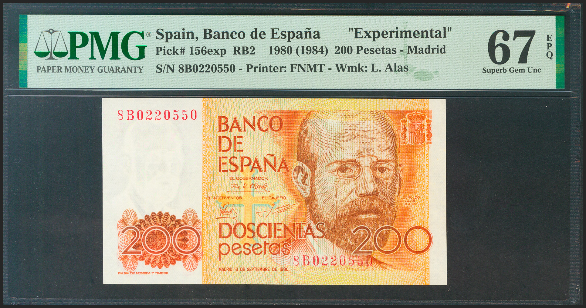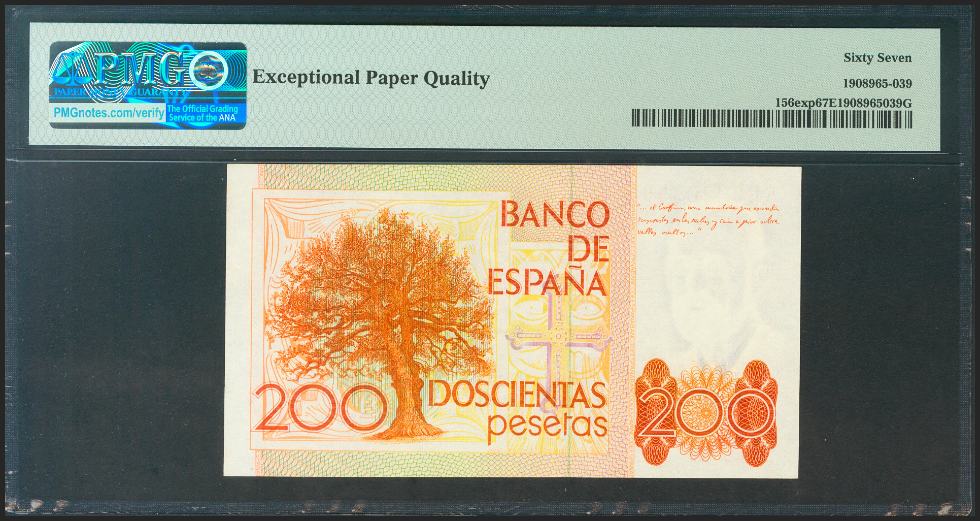 200 Pesetas. 16 de Septiembre de 1980. Serie especial 8B. (Edifil 2021: 480c, Pick: 156exp). Rarísimo en esta excepcional calidad, apresto original. SC. Encapsulado PMG67EPQ.