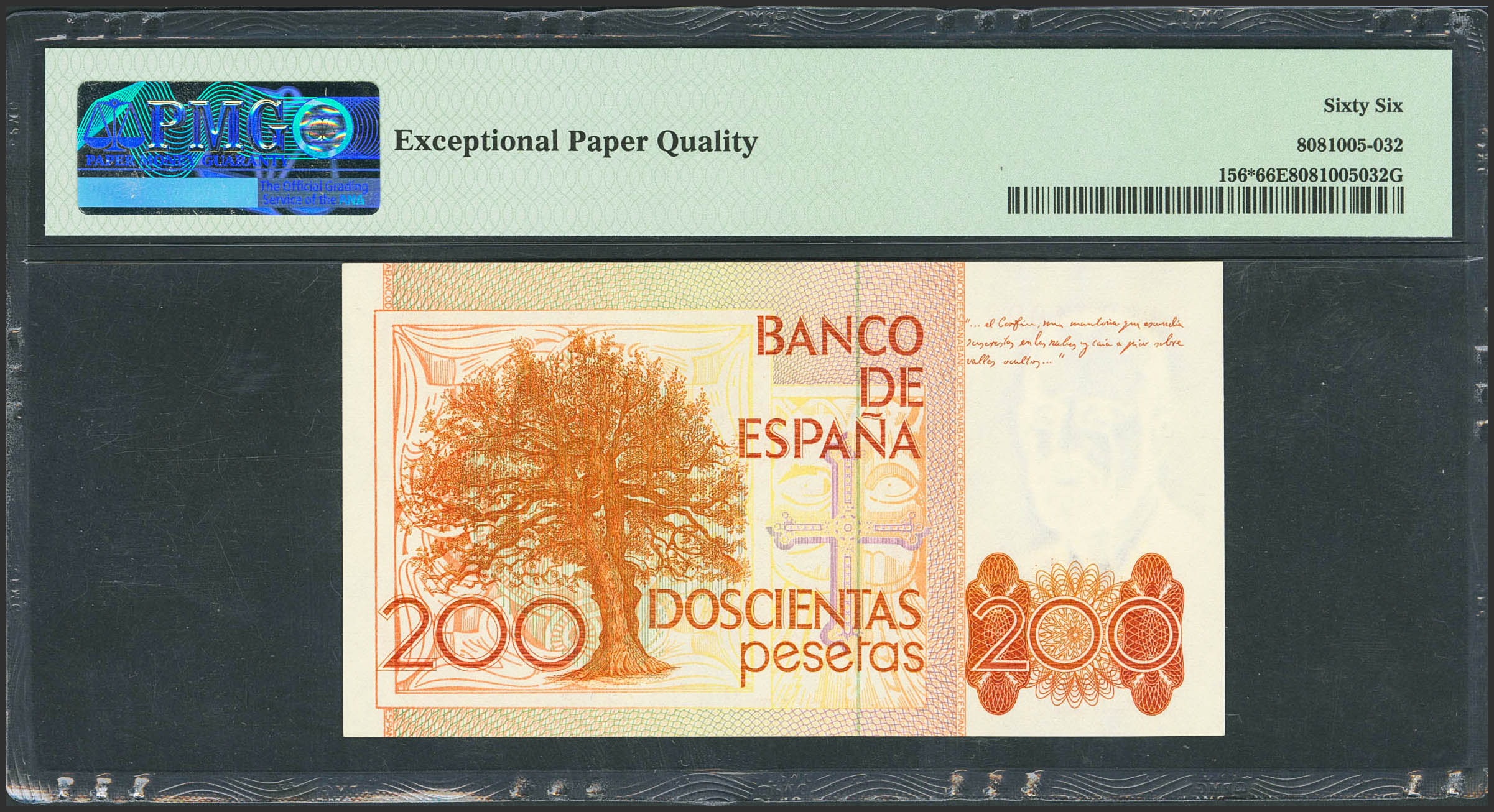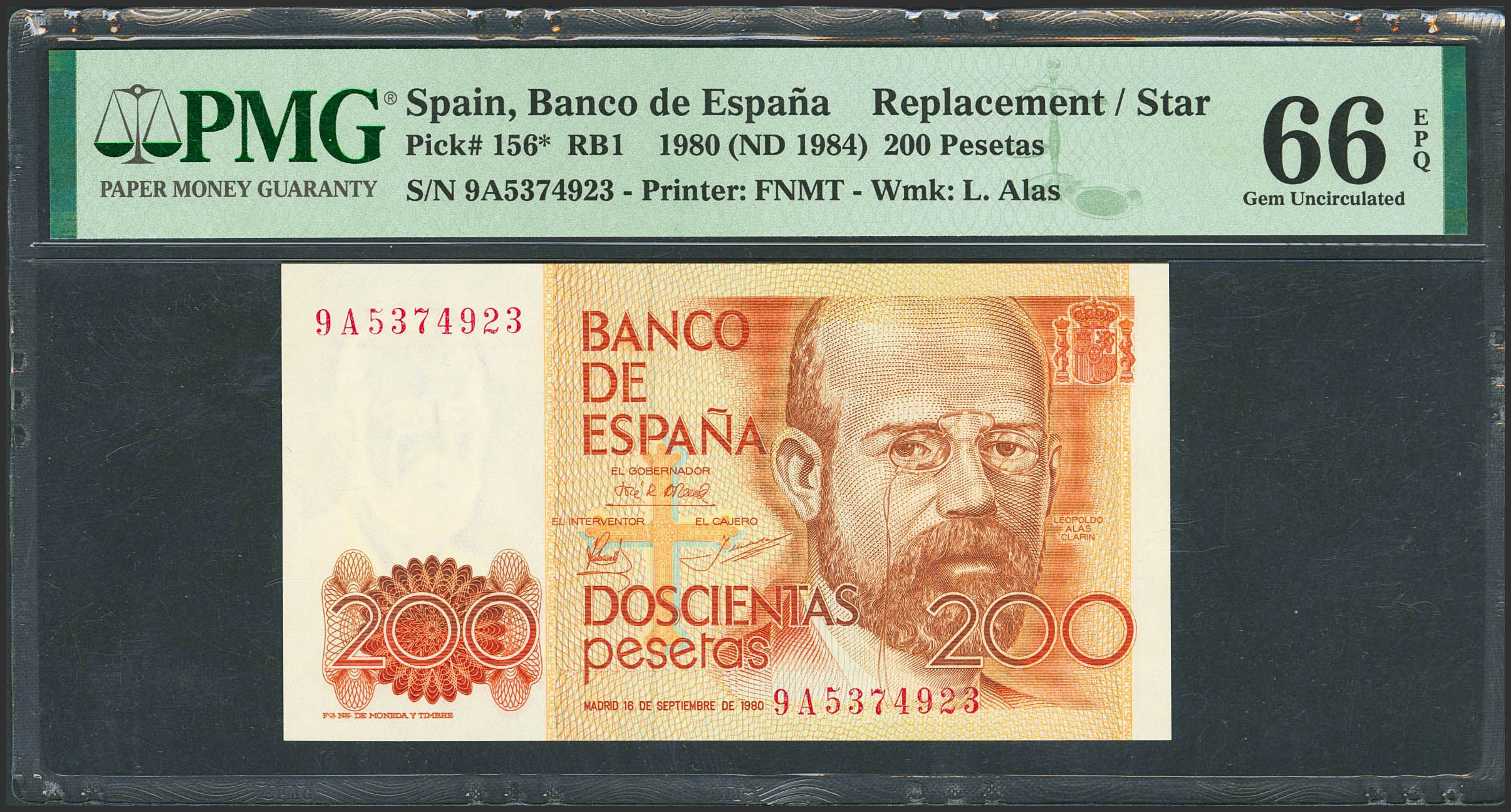 200 Pesetas. 16 de Septiembre de 1980. Serie especial 9A. (Edifil 2021: 480b, Pick: 156*). Inusual en esta excepcional calidad. SC. Encapsulado PMG66EPQ.