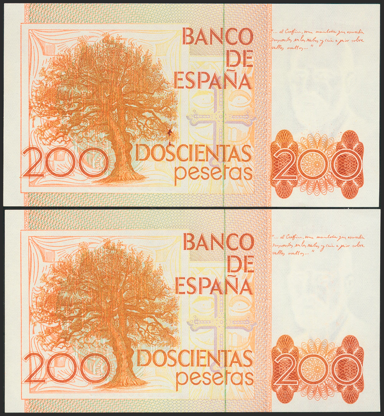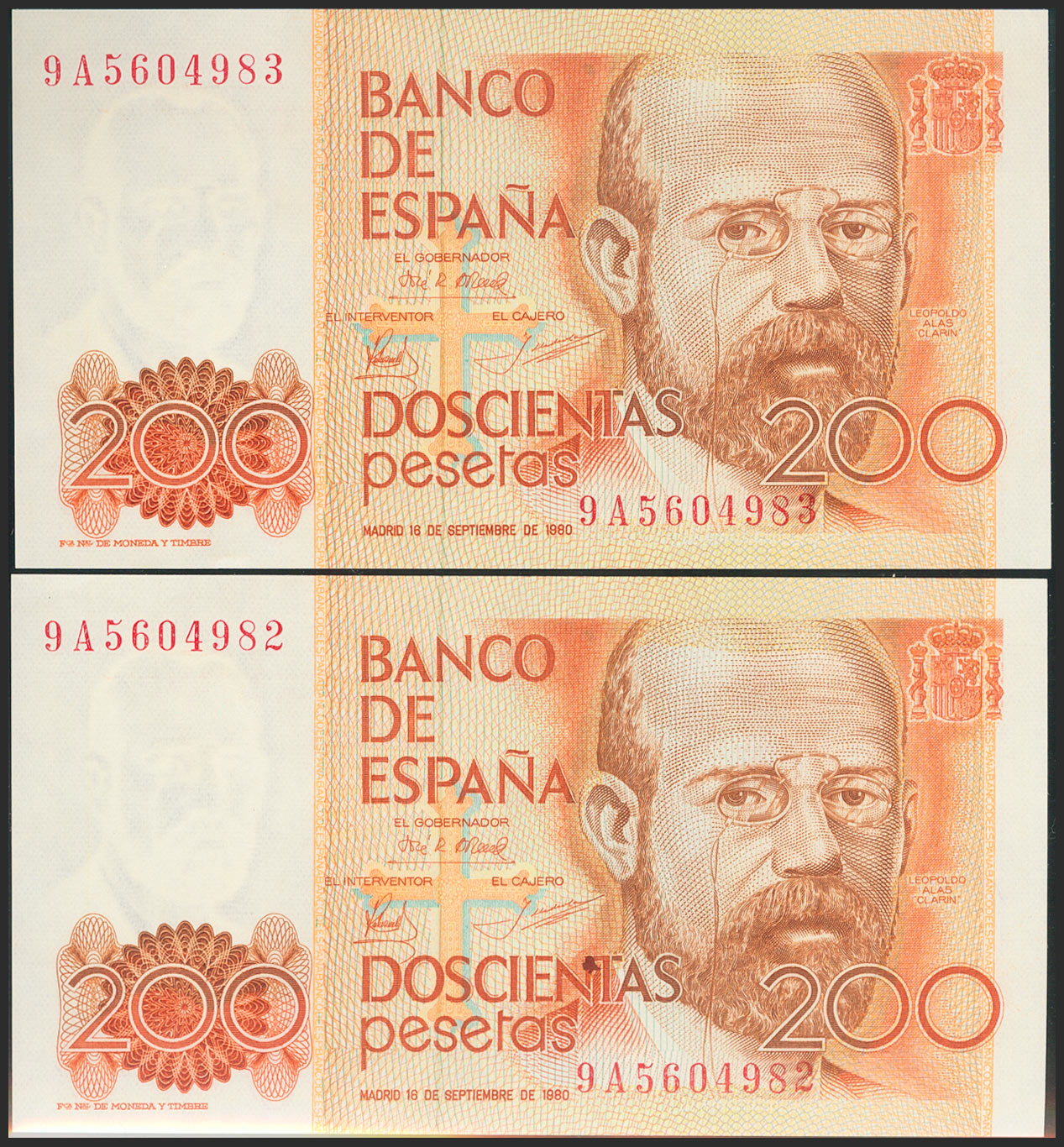 200 Pesetas. 16 de Septiembre de 1980. Pareja correlativa. Serie especial 9A. (Edifil 2021: 480b). SC.