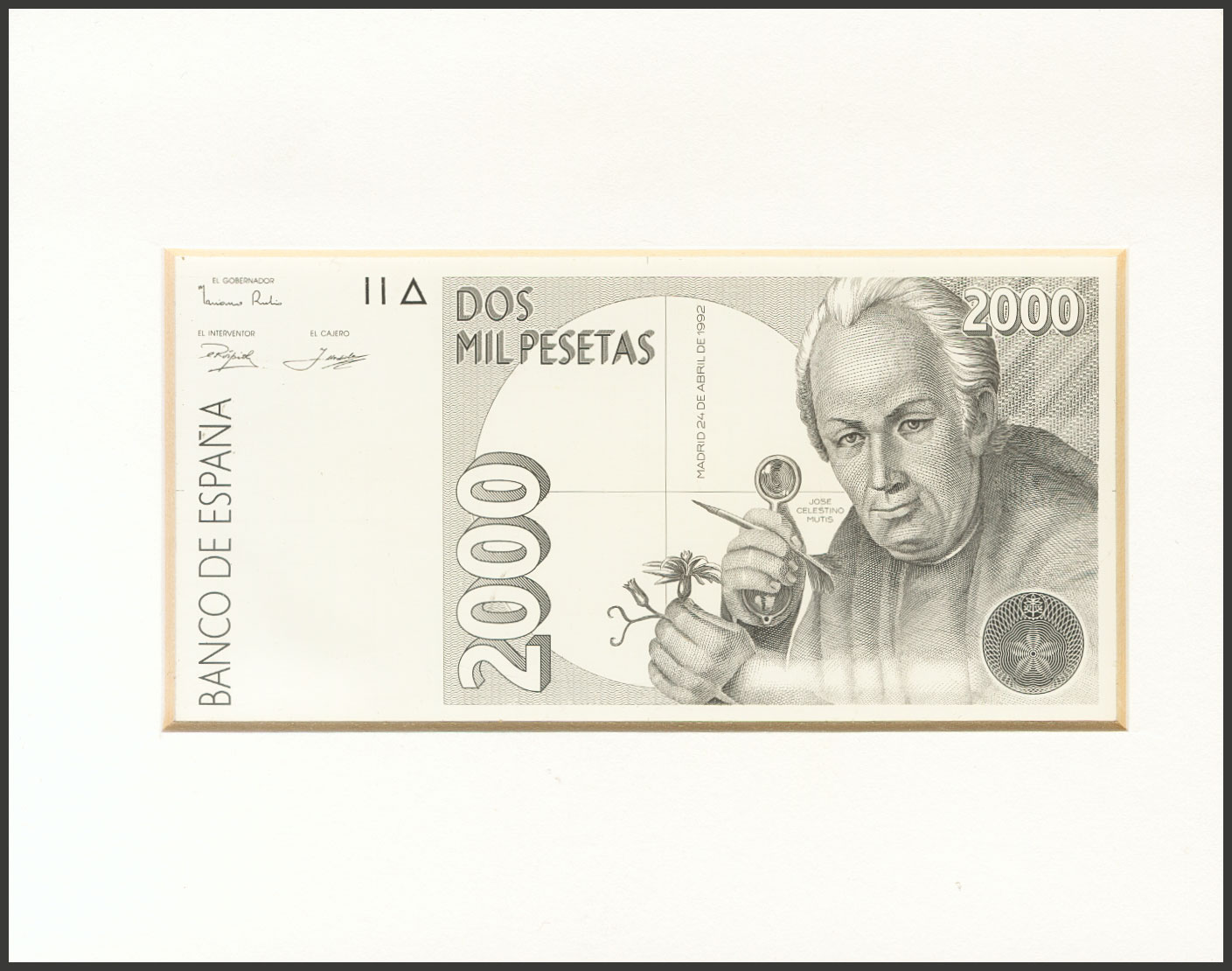 Prueba calcográfica sin numeración y en negro del anverso del billete de 2000 Pesetas emitido el 24 de Mayo de 1992. (Edifil 2023: 482P, Cobo: 18b). Muy rara y verdaderamente espectacular. SC.