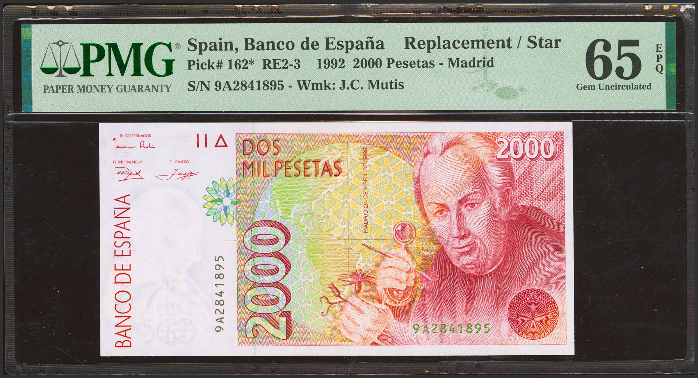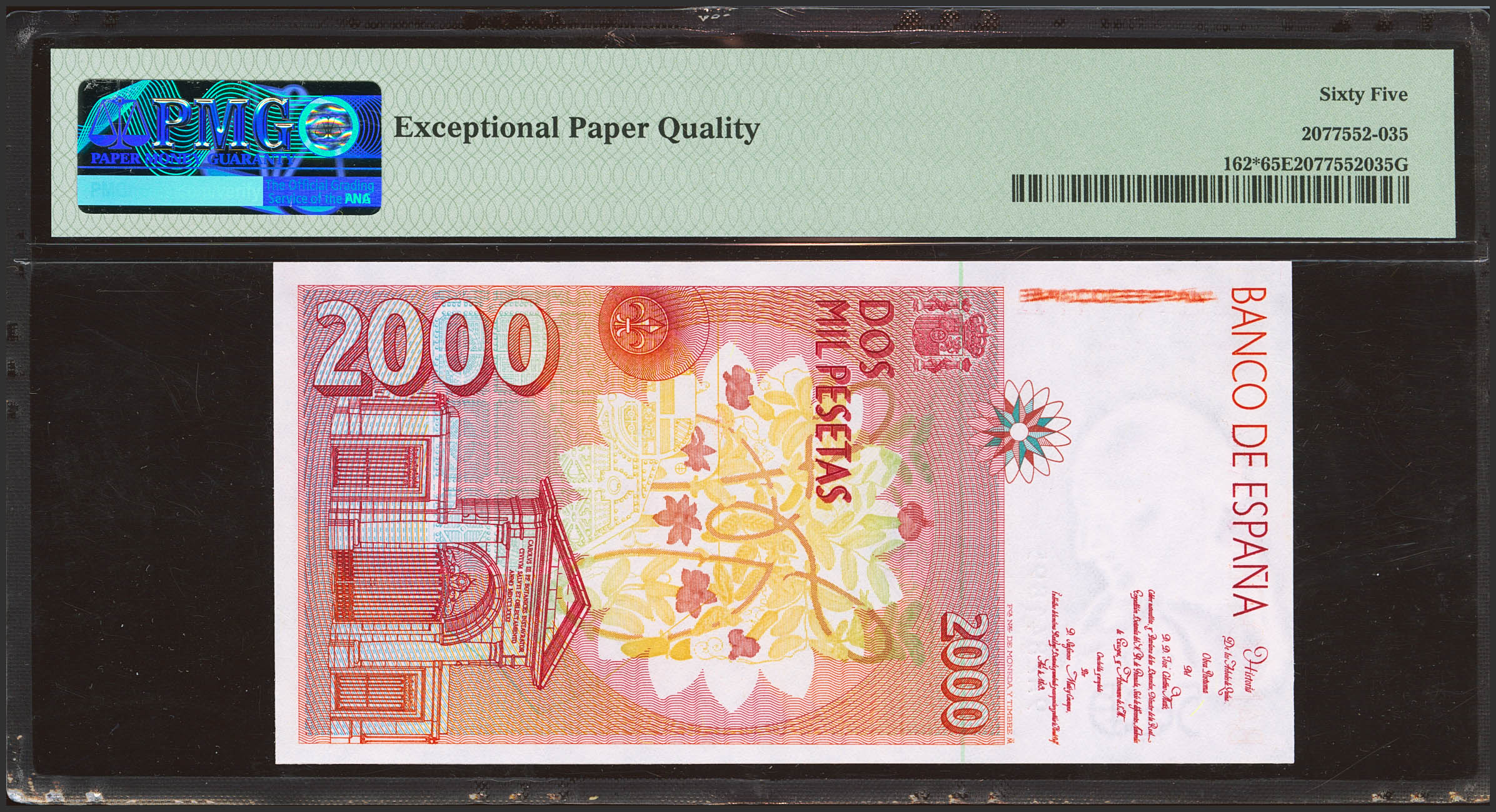 2000 Pesetas. 24 de Abril de 1992. Serie especial 9A. (Edifil 2023: 482b, Pick: 162*). Muy rara serie, especialmente en esta calidad. SC. Encapsulado PMG65EPQ.