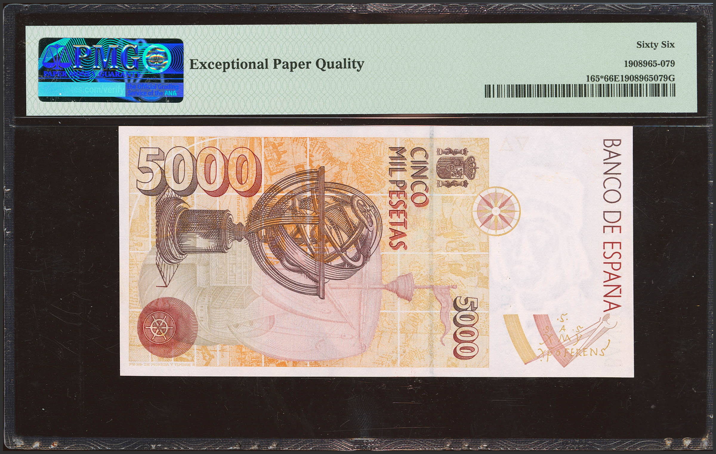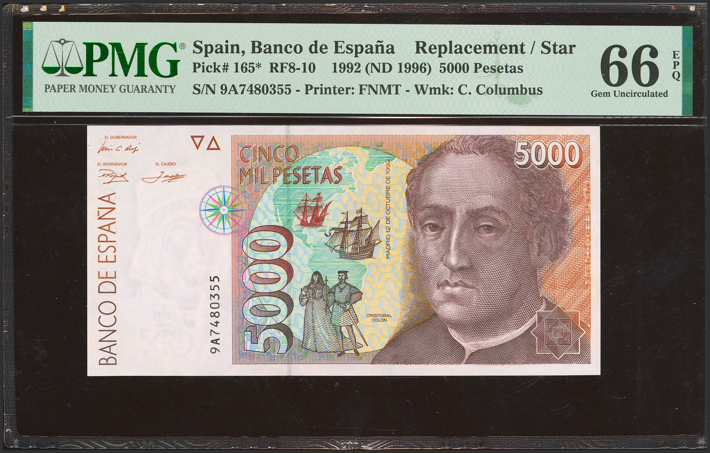 5000 Pesetas. 12 de Octubre de 1992. Serie especial 9A. (Edifil 2023: 484b, Pick: 165*). Raro en esta excepcional calidad, apresto original. SC. Encapsulado PMG66EPQ.