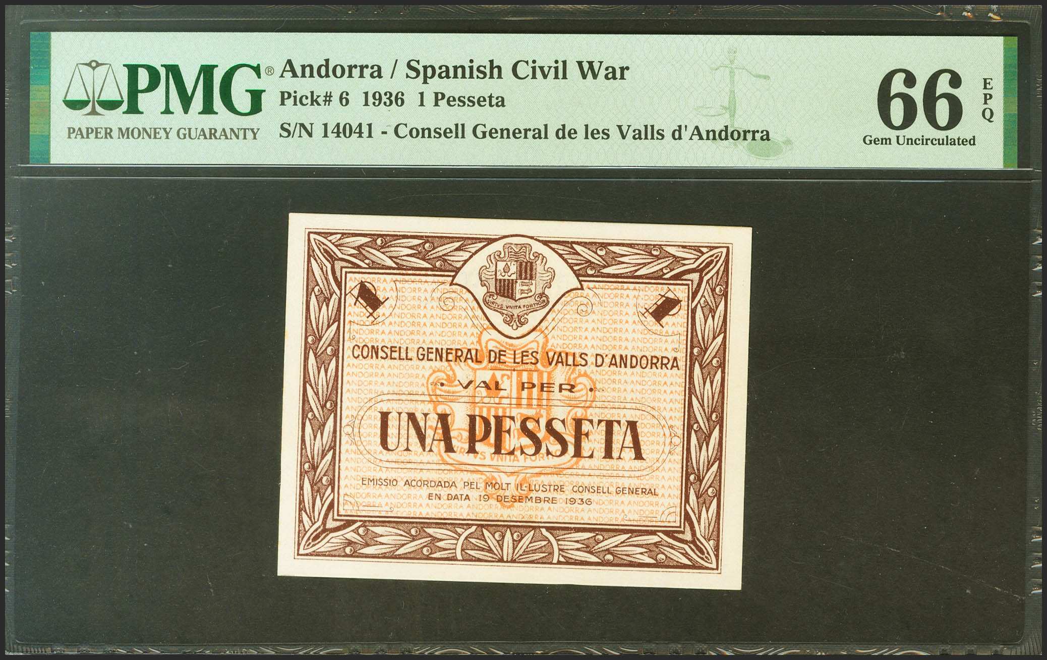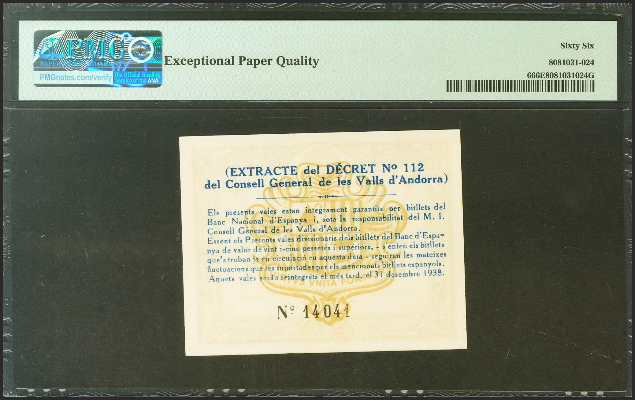 ANDORRA. 1 Pesseta. 19 de Diciembre de 1936. Sin serie. (Edifil 2021: 3, Pick: 6). Raro, especialmente en esta excepcional calidad, apresto original. Encapsulado PMG66EPQ.