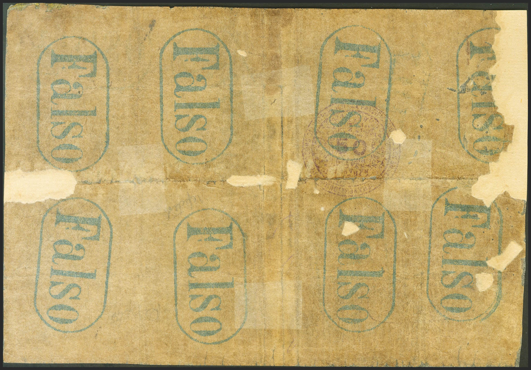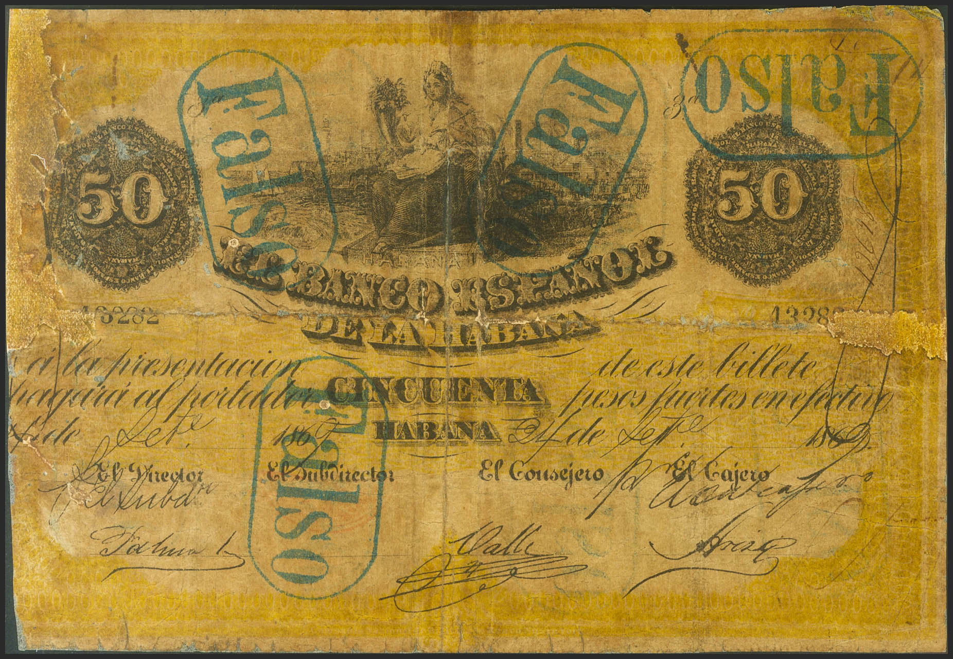 50 Pesos. 1869. Banco Español de la Habana, emisión de Nueva York. Falso de época, con diferentes estampaciones de la marca FALSO, tanto en anverso como en reverso. Serie 3ª. (Pick: 14, Edifil 2021: 25, Echenagusía: 15). Extraordinariamente raro, para hacernos idea de la rareza de este ejemplar, desde que existen registros de subastas en internet únicamente se han subastado dos billetes falso de época similares a este y sólo otro billete original, billete reforzado debido a la tropicalización del papel, es muy habitual este tipo de actuación sobre billetes cubanos. BC.