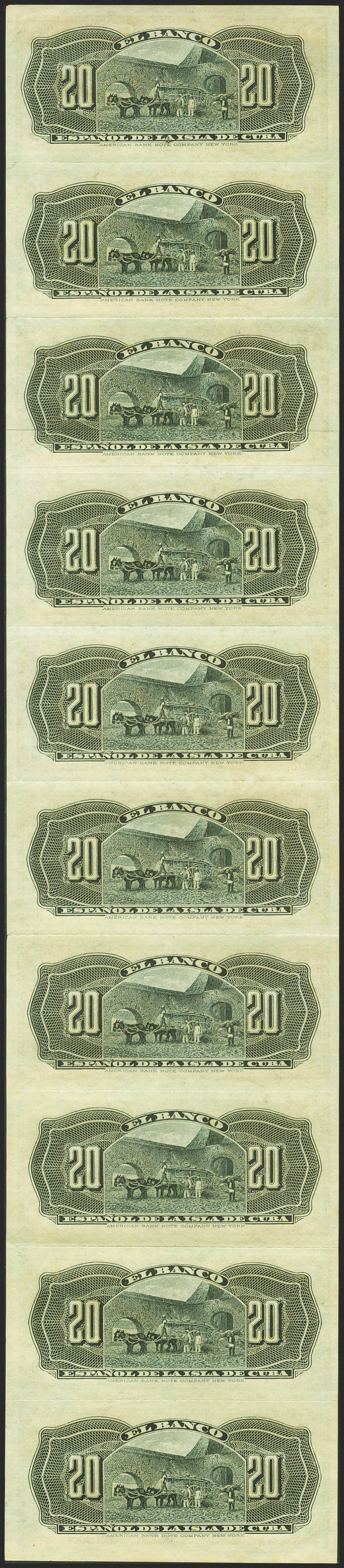 BANCO ESPAÑOL DE LA ISLA DE CUBA. 20 Centavos. 15 de Febrero de 1897. Serie I. (Edifil 2017: 85). Pliego completo de 10 billetes. Inusual. SC/SC-.