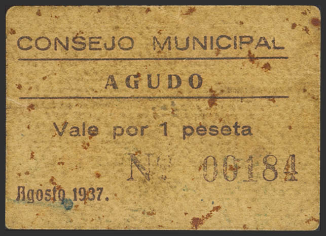 AGUDO (CIUDAD REAL). 1 Peseta. Agosto de 1937. (González: 83). Muy raro. EBC-.