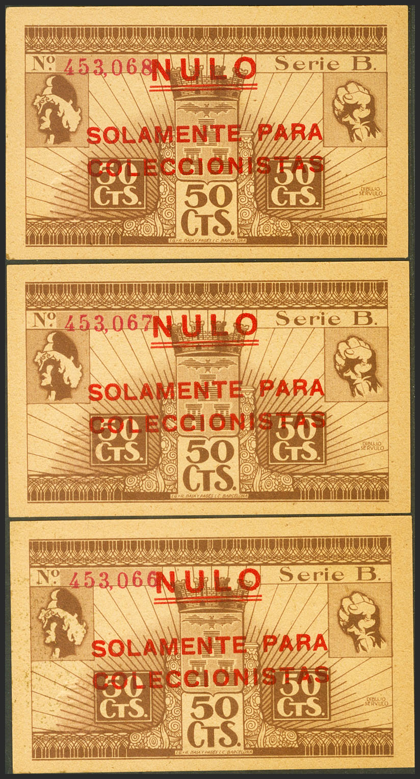 ALBACETE. 50 Céntimos. 8 de Noviembre de 1937. Trío correlativo. Tampón "Nulo solamente para coleccionistas". Serie B. (González: 131). SC.