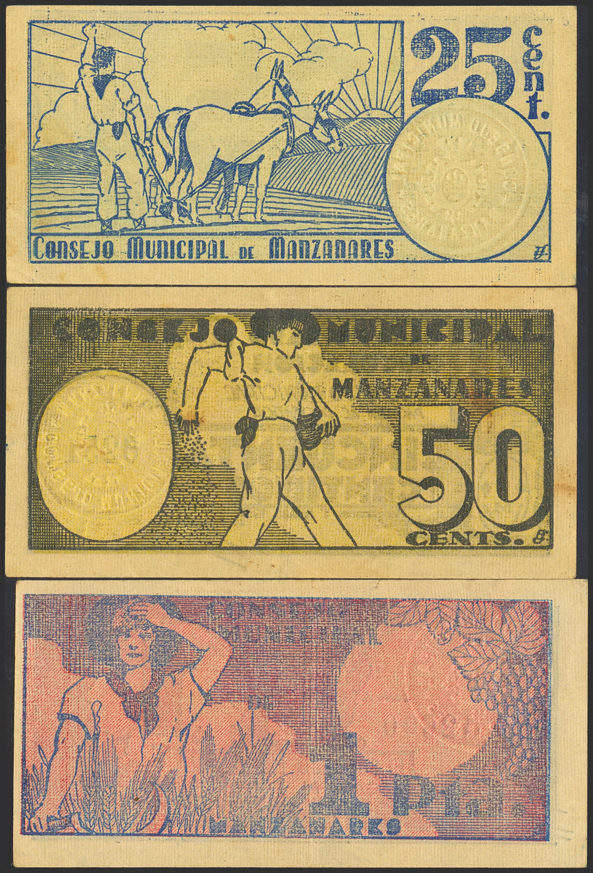 MANZANARES (CIUDAD REAL). 25 Céntimos, 50 Céntimos y 1 Peseta. 1 de Abril de 1937. Series C, B y A, respectivamente. (González: 3369/71). Serie completa. EBC/MBC+.