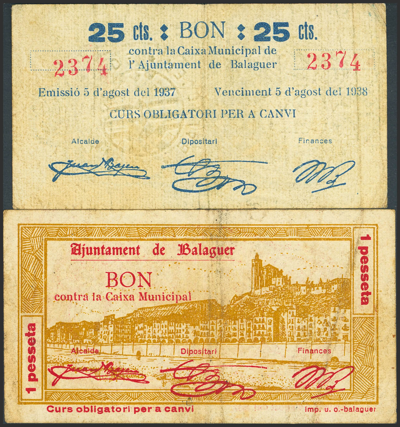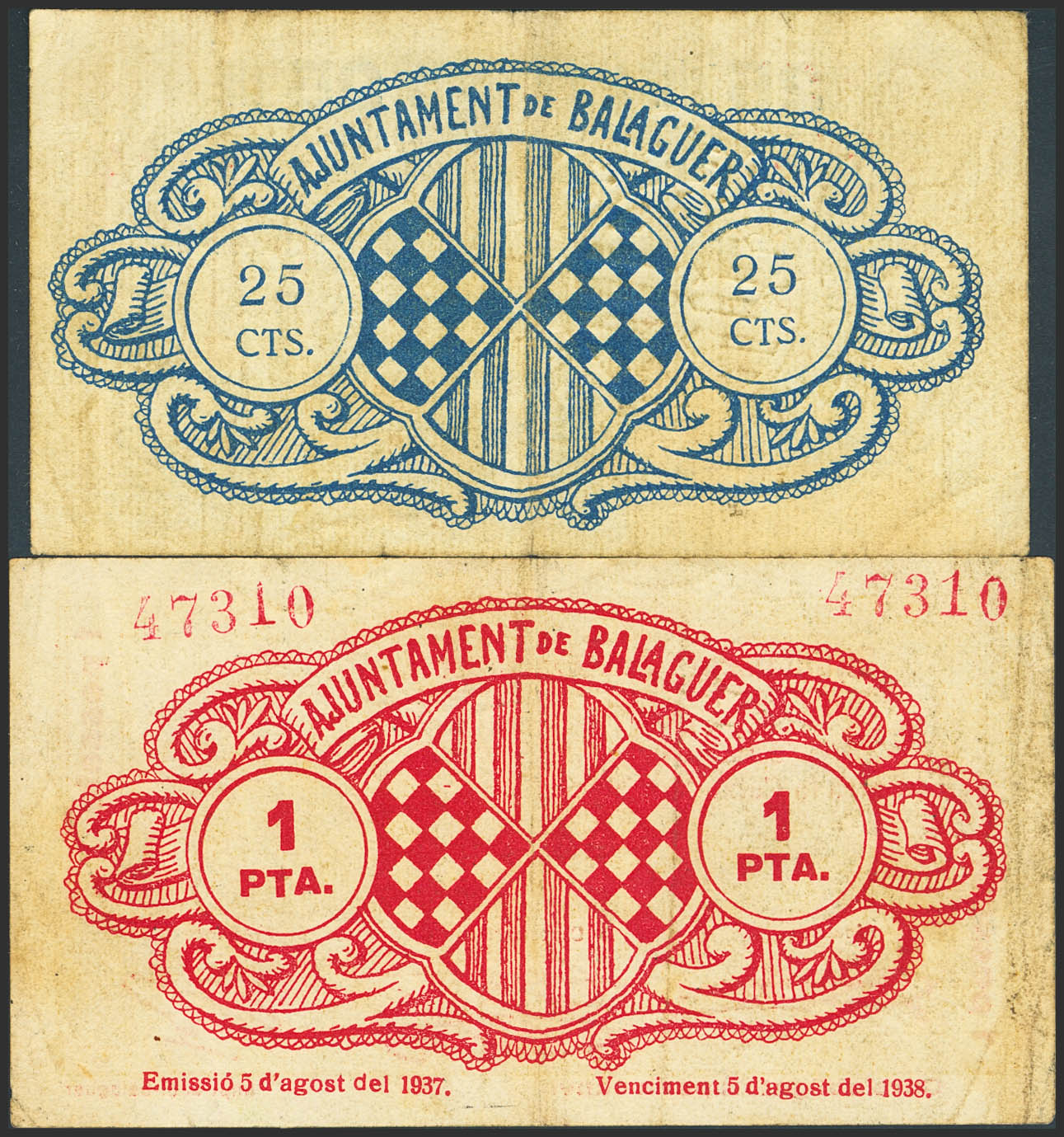 BALAGUER (LERIDA). 25 Céntimos y 1 Peseta. 5 de Agosto de 1937. (González: 6486, 6488). MBC.