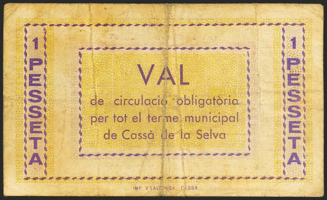 CASSA DE LA SELVA (GERONA). 1 Peseta. 16 de Febrero de 1937. (González: 7408). MBC.