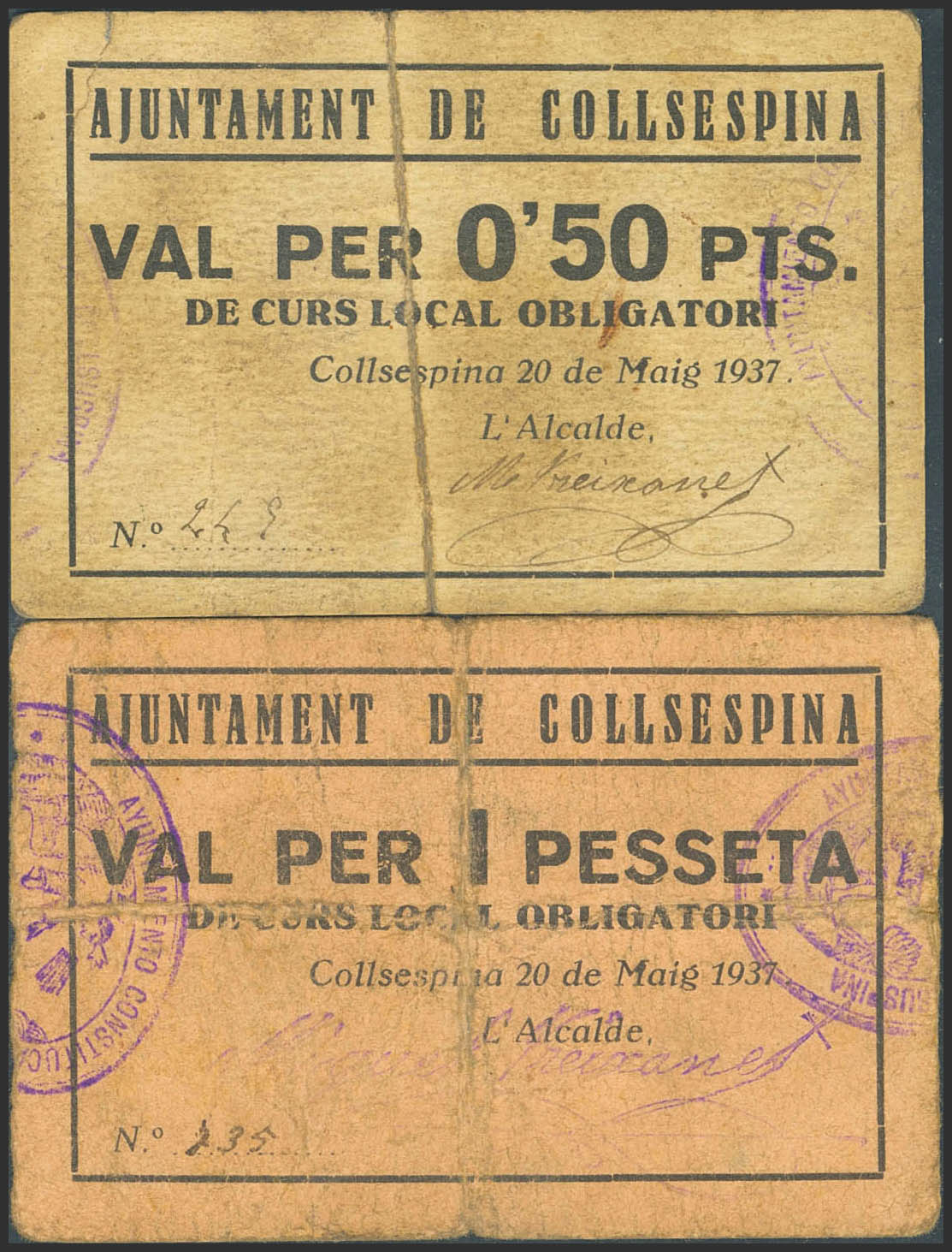 COLLSESPINA (BARCELONA). 50 Céntimos y 1 Peseta. 20 de Mayo de 1937. (González: 7642, 7644). Muy raros. MBC-.