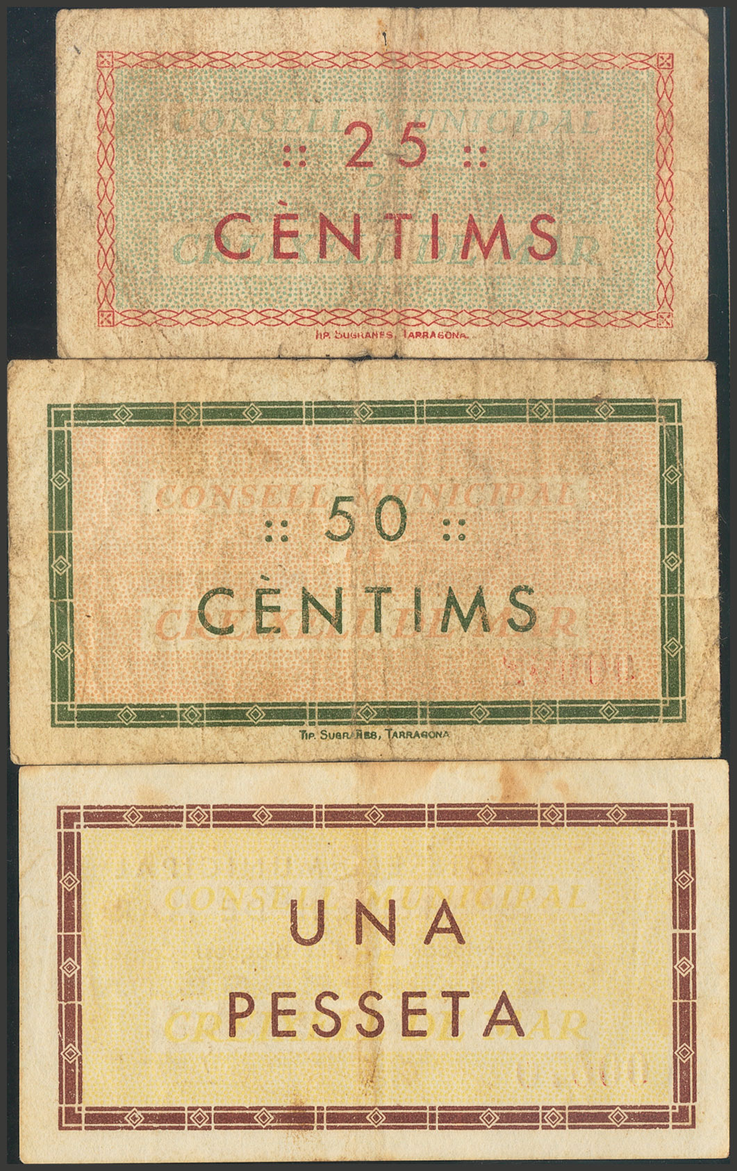 CREIXELL DE MAR (TARRAGONA). 25 Céntimos, 50 Céntimos y 1 Peseta. 10 de Junio de 1937. (González: 7700/02). Rara serie completa. BC/MBC.