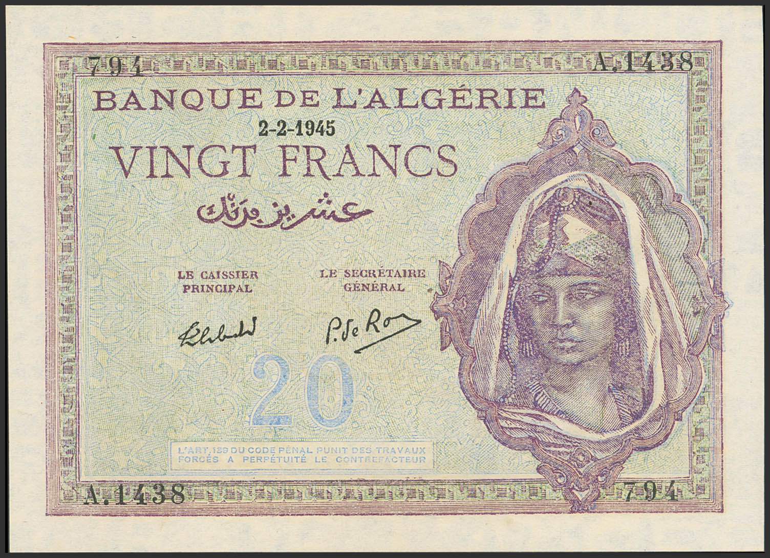 ALGERIA. 20 Francs. 2 February 1945. (Pick: 92b). Unusual. Uncirculated.