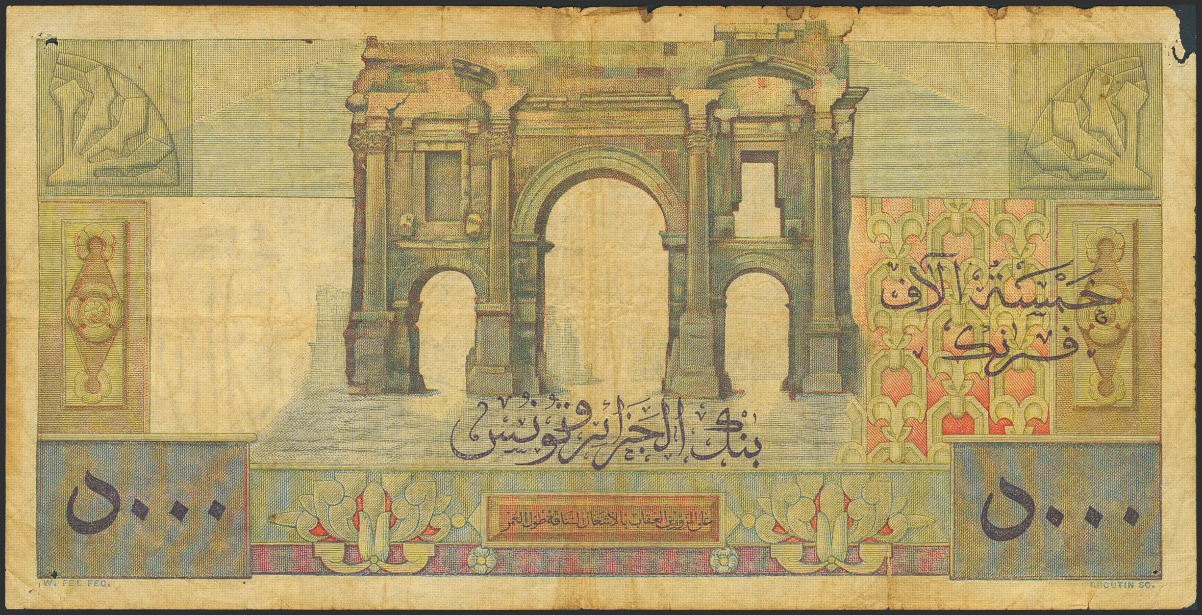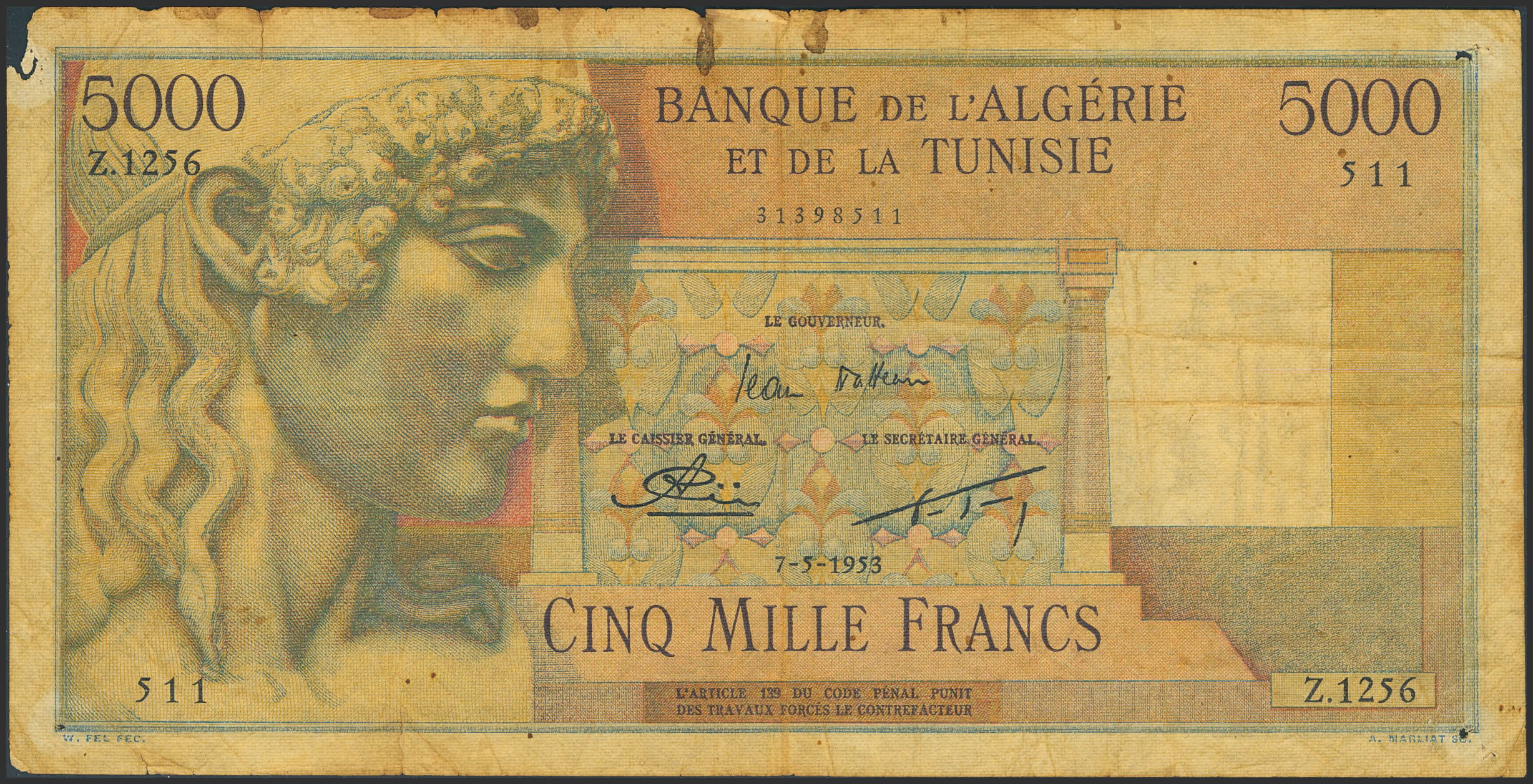 ALGERIA. 5000 Francs. 7 May 1953. (Pick: 109). Top left corner missing and pinholes. Very Good.
