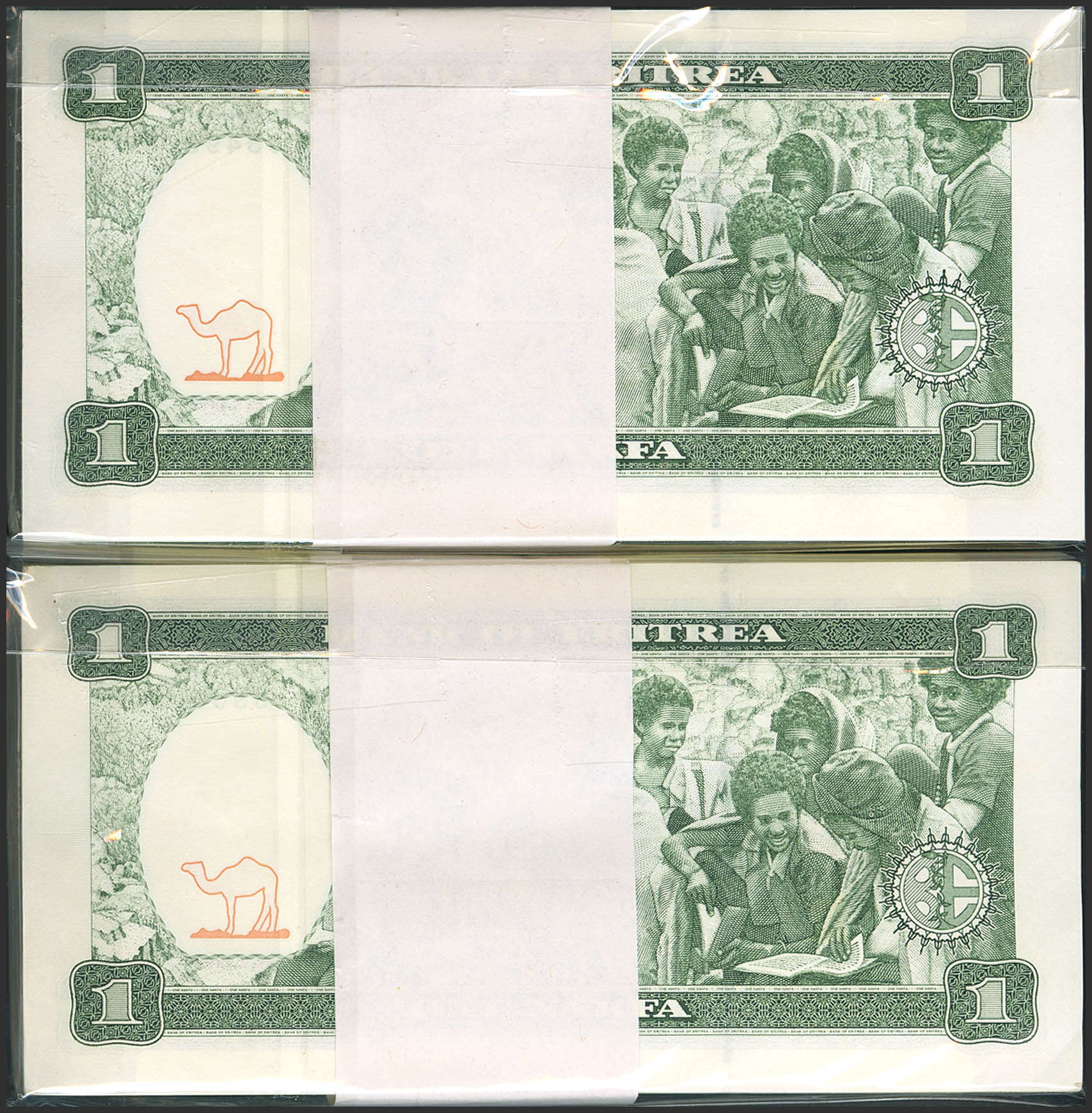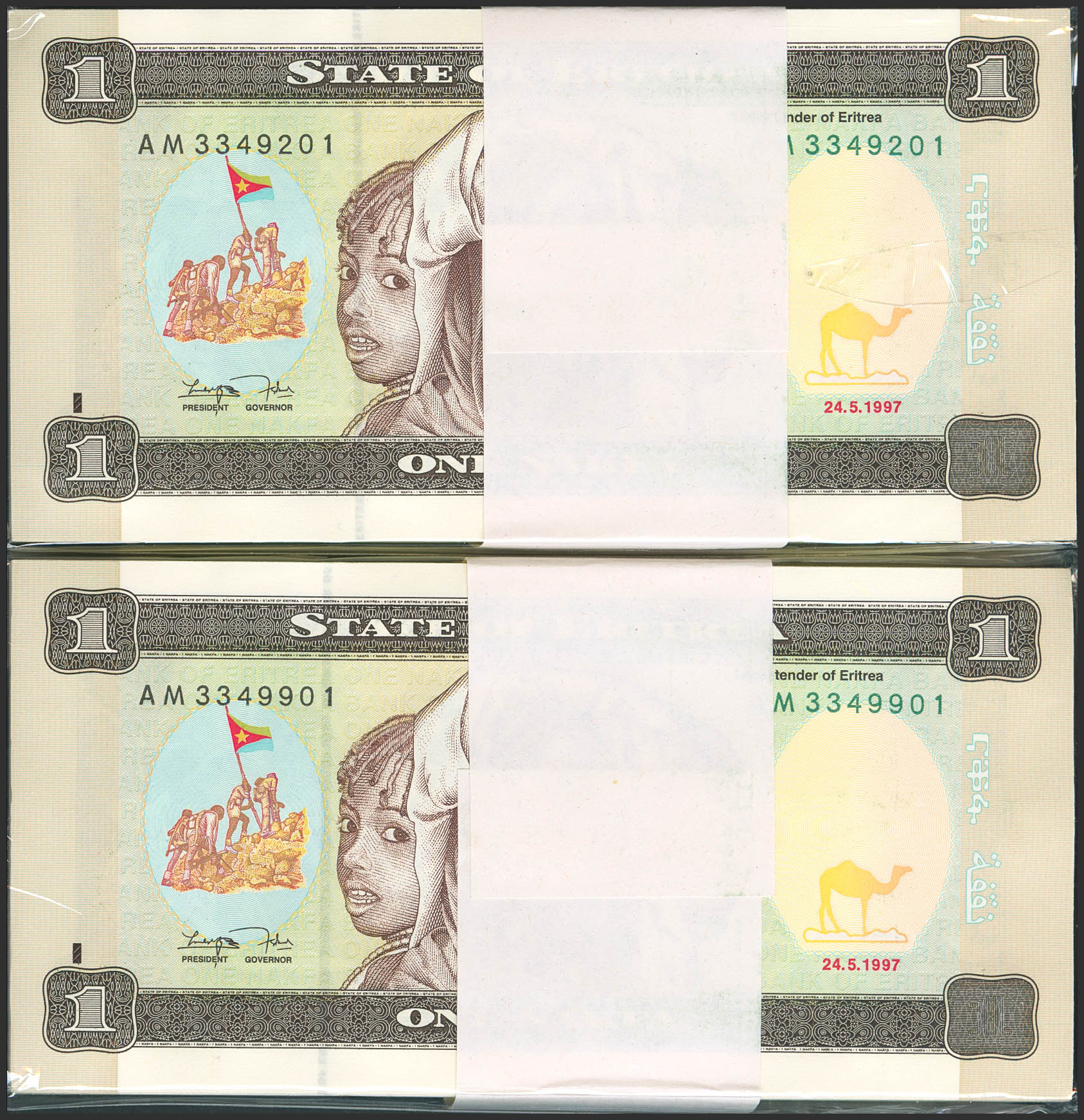 Set of 2 bundles of 100 banknotes from Eritrea of various denominations, most of them very nice qualities. TO EXAM.