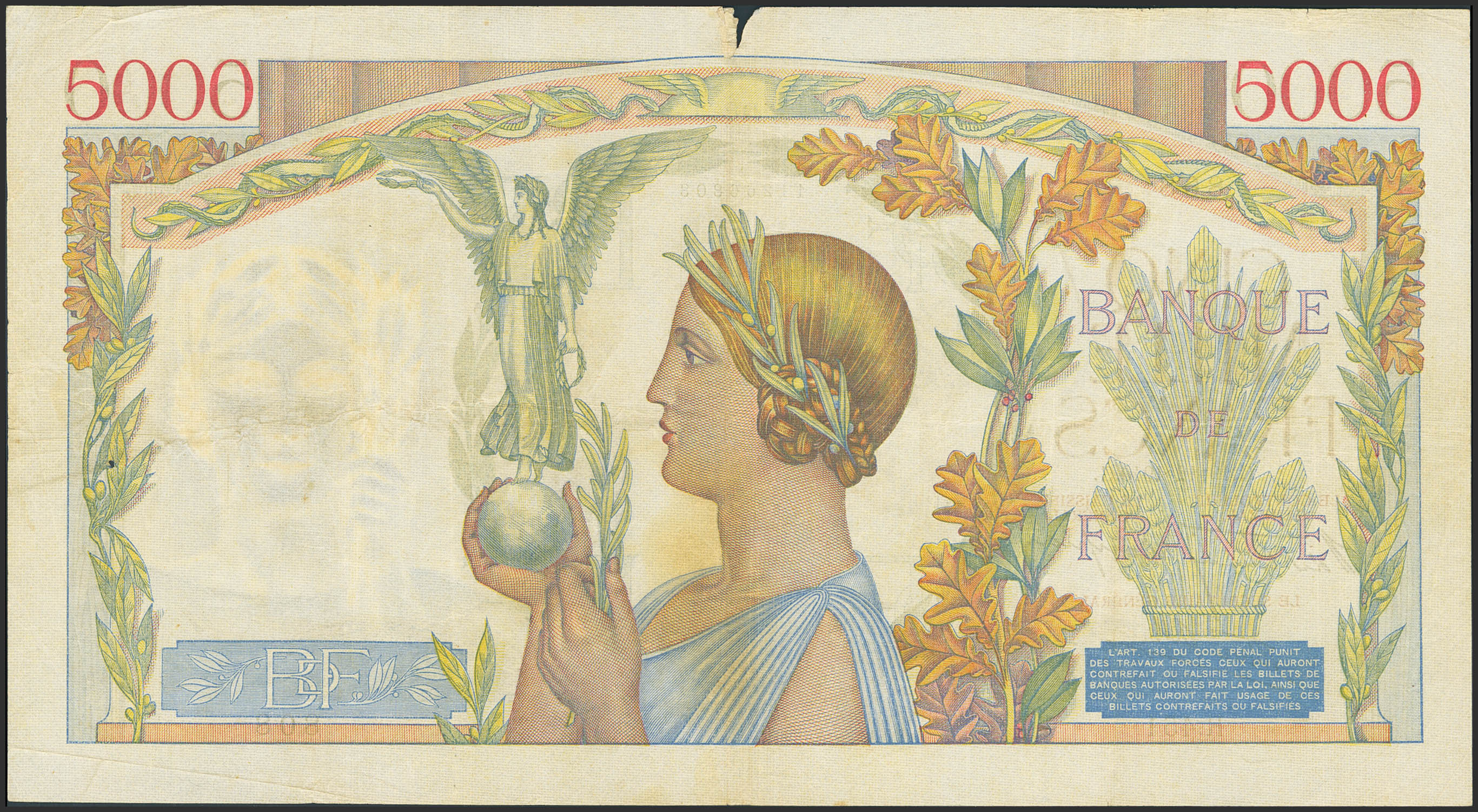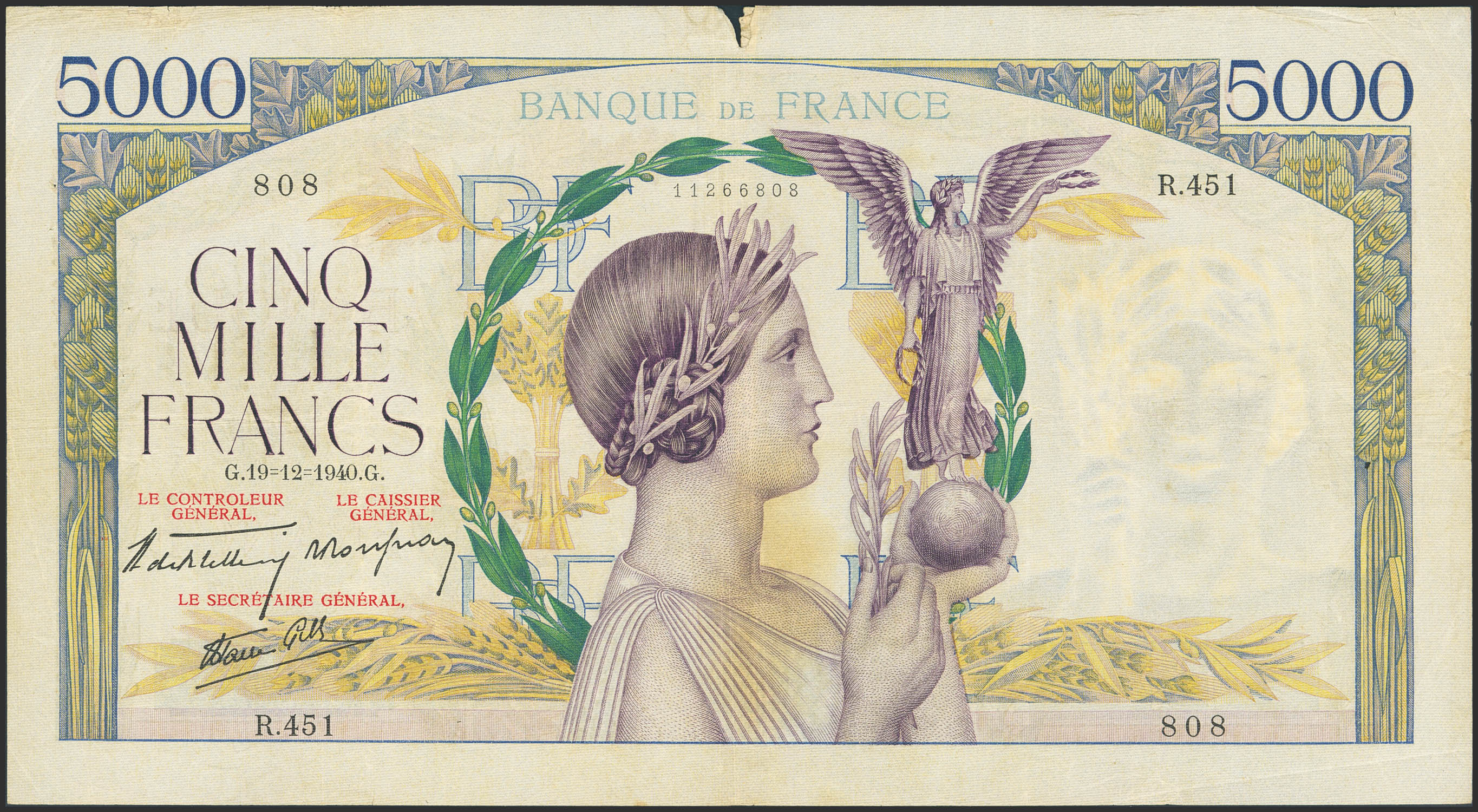 FRANCE. 5000 Francs. 19 December 1940. (Pick: 97). Unusual. Less than Very Fine.