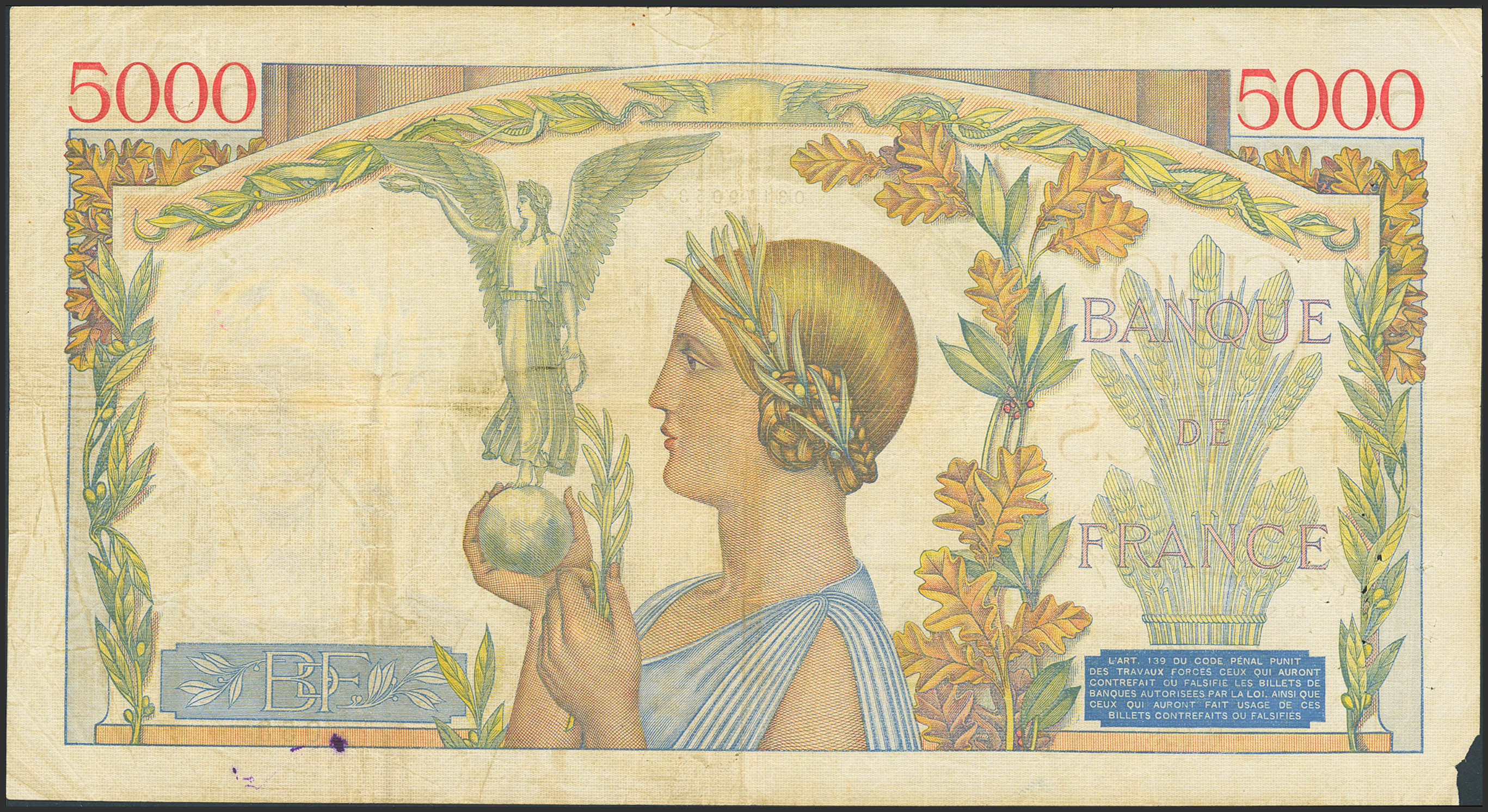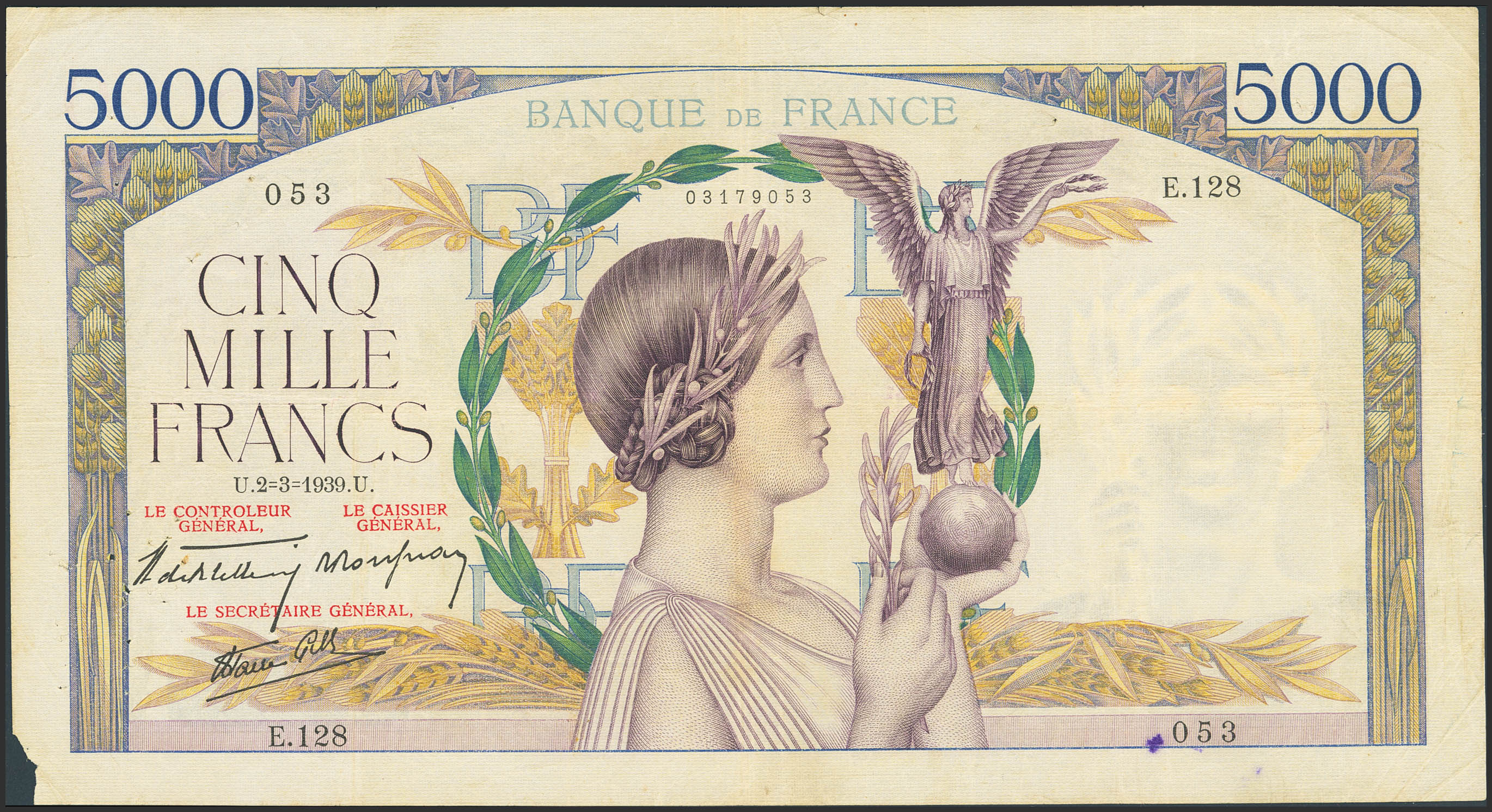 FRANCE. 5000 Francs. 2 March 1939. (Pick: 97). Unusual, pinholes. Fine.