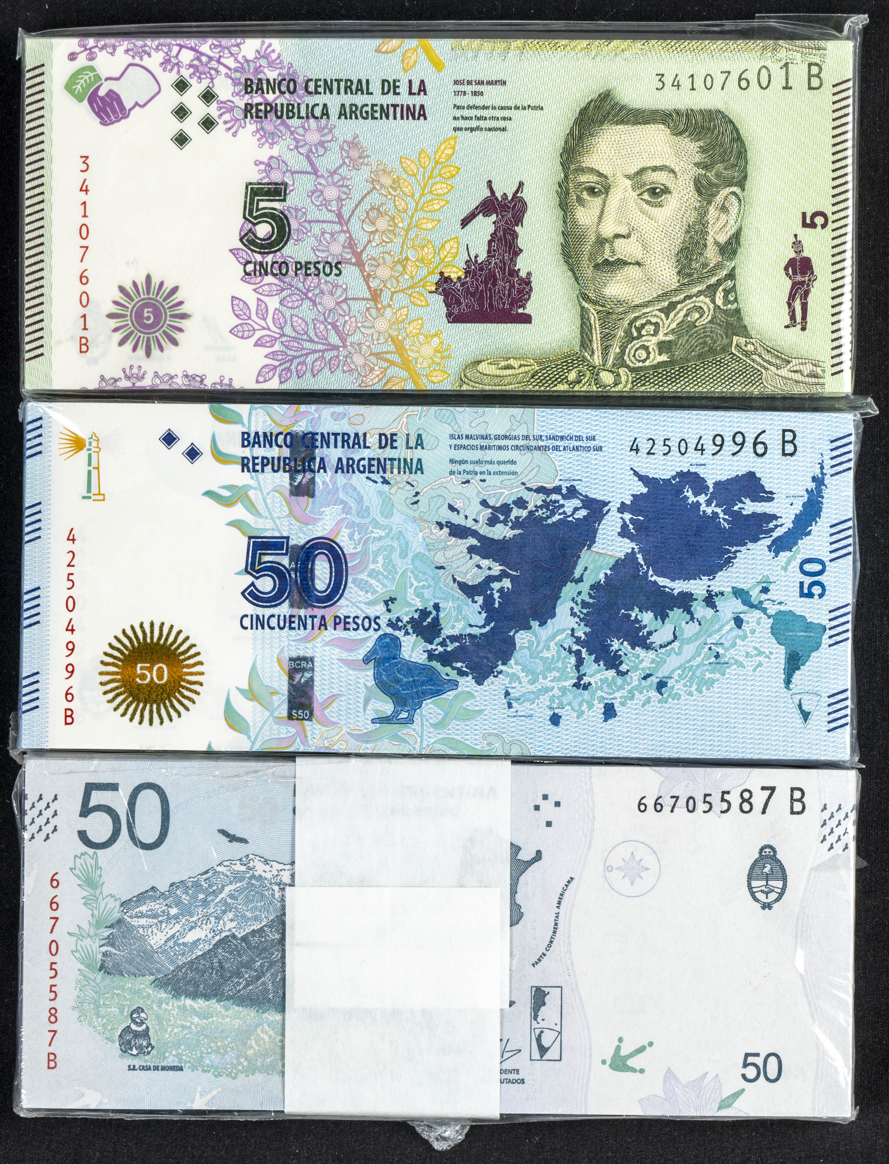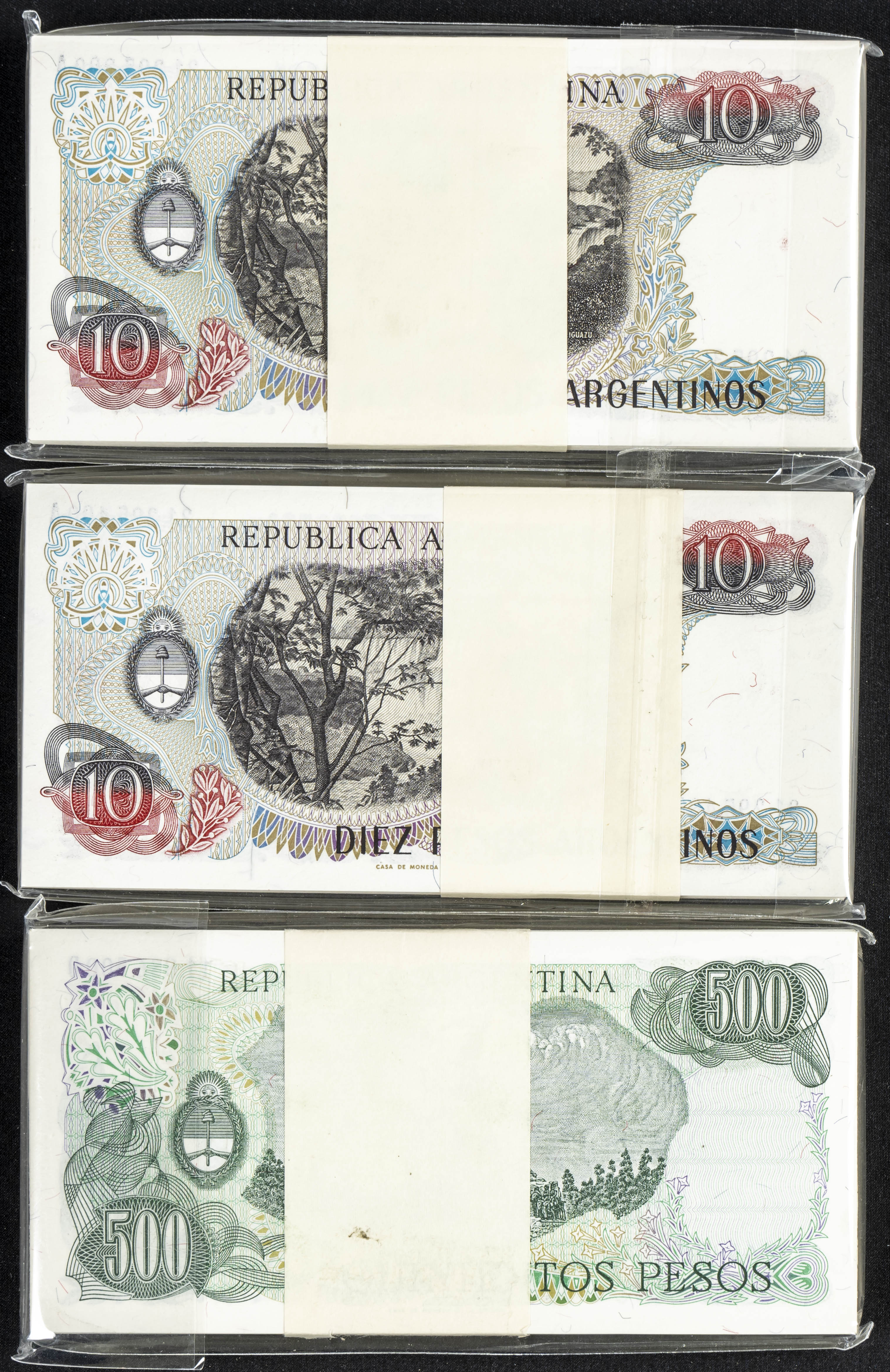 Set of 6 bundles of 100 banknotes from Argentina of various denominations, most of them very nice qualities. TO EXAM.