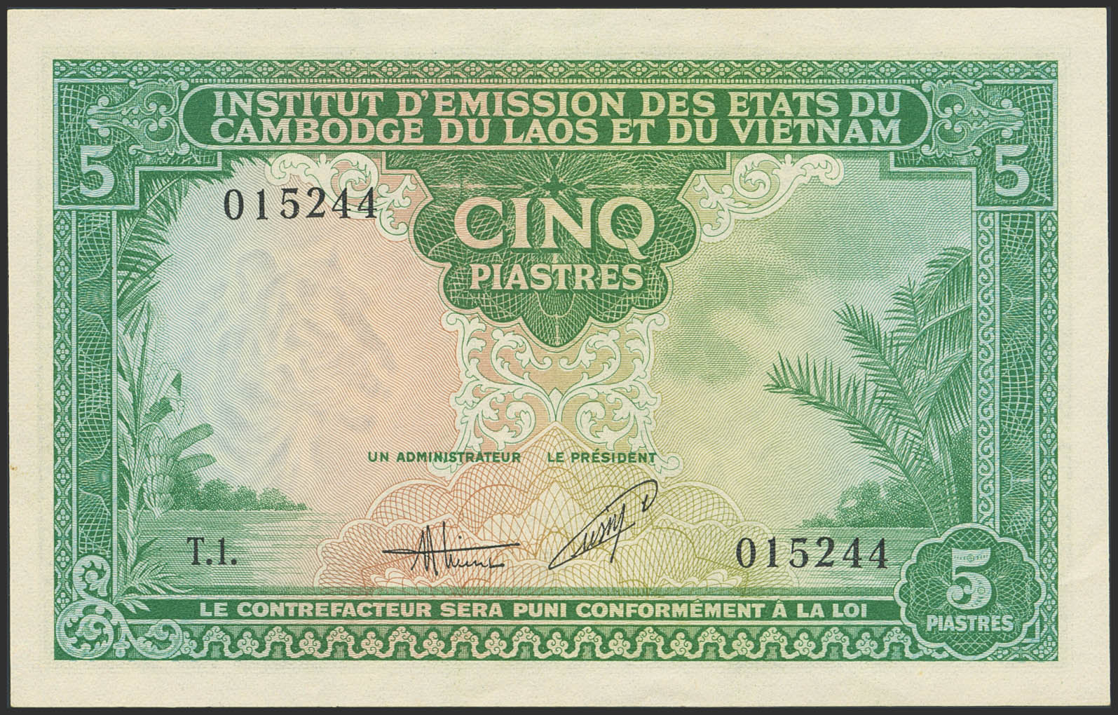 FRENCH-INDOCHINA. 5 Piastres. (1953ca). (Pick: 101). About Uncirculated.
