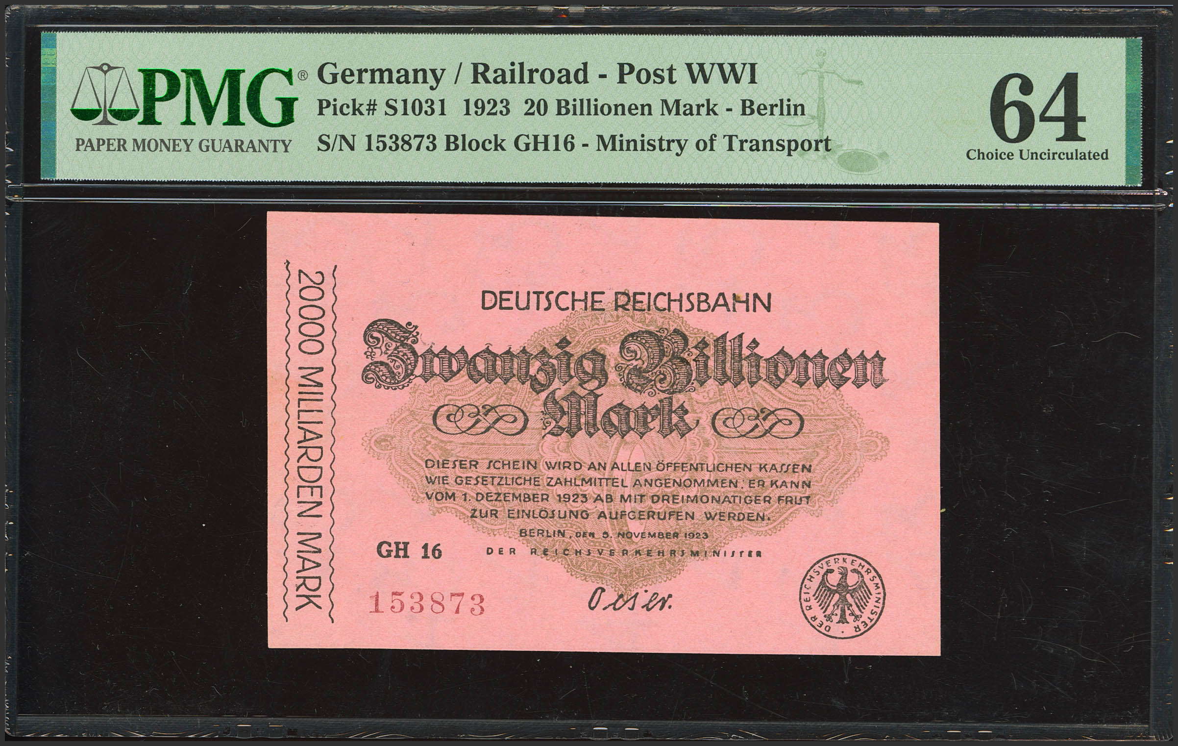 GERMANY. 20 Billionen Mark. Railroad post WWI. 5 November 1923. (Pick: S1031). PMG64 (Minor foreign substance).