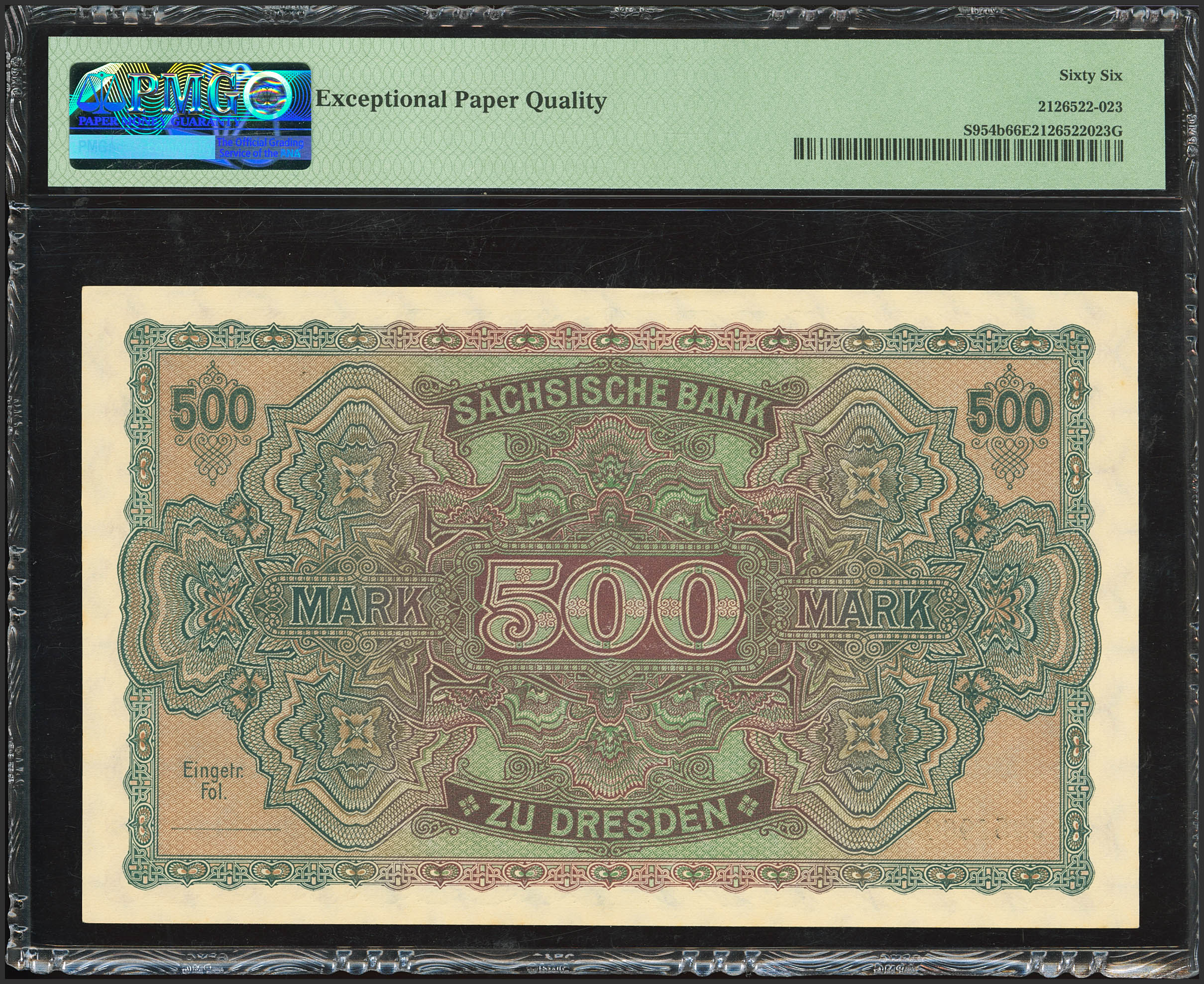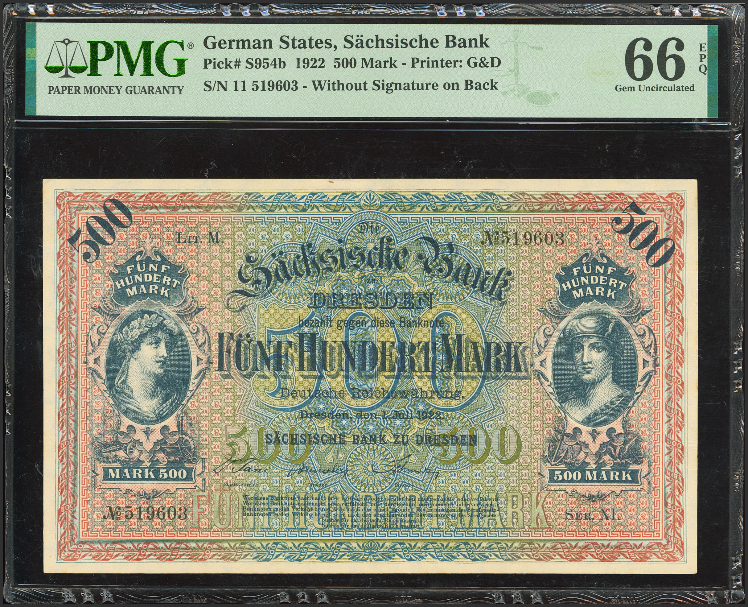 GERMAN STATES. 500 Mark. 1 July 1922. (Pick: S954b). Rare, especially in this exceptional quality. PMG66EPQ.