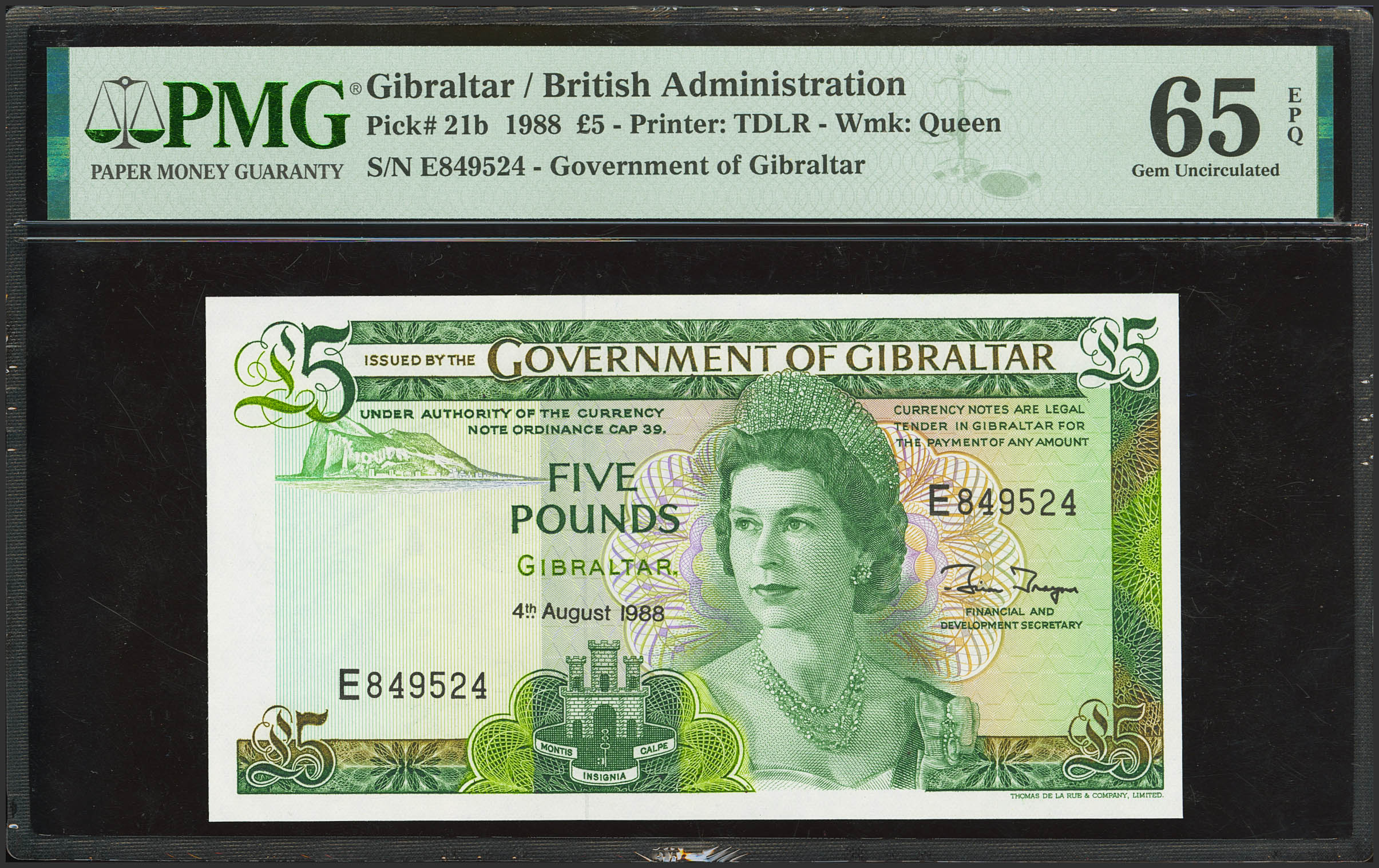 GIBRALTAR. 5 Pounds. 4 August 1988. (Pick: 21b). PMG65EPQ.