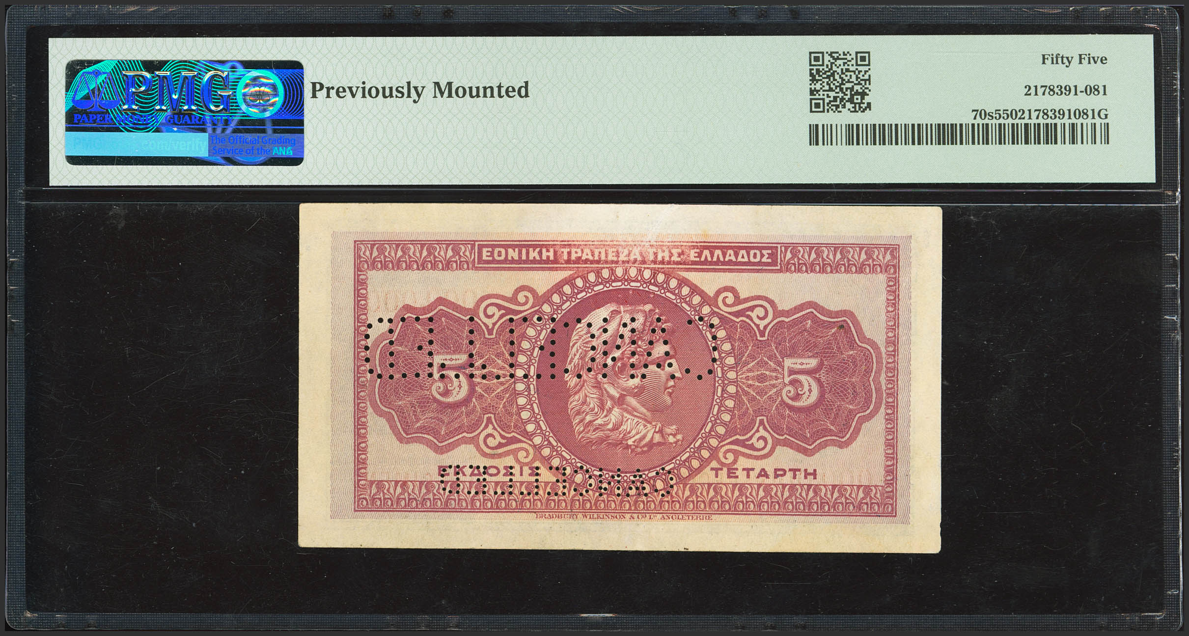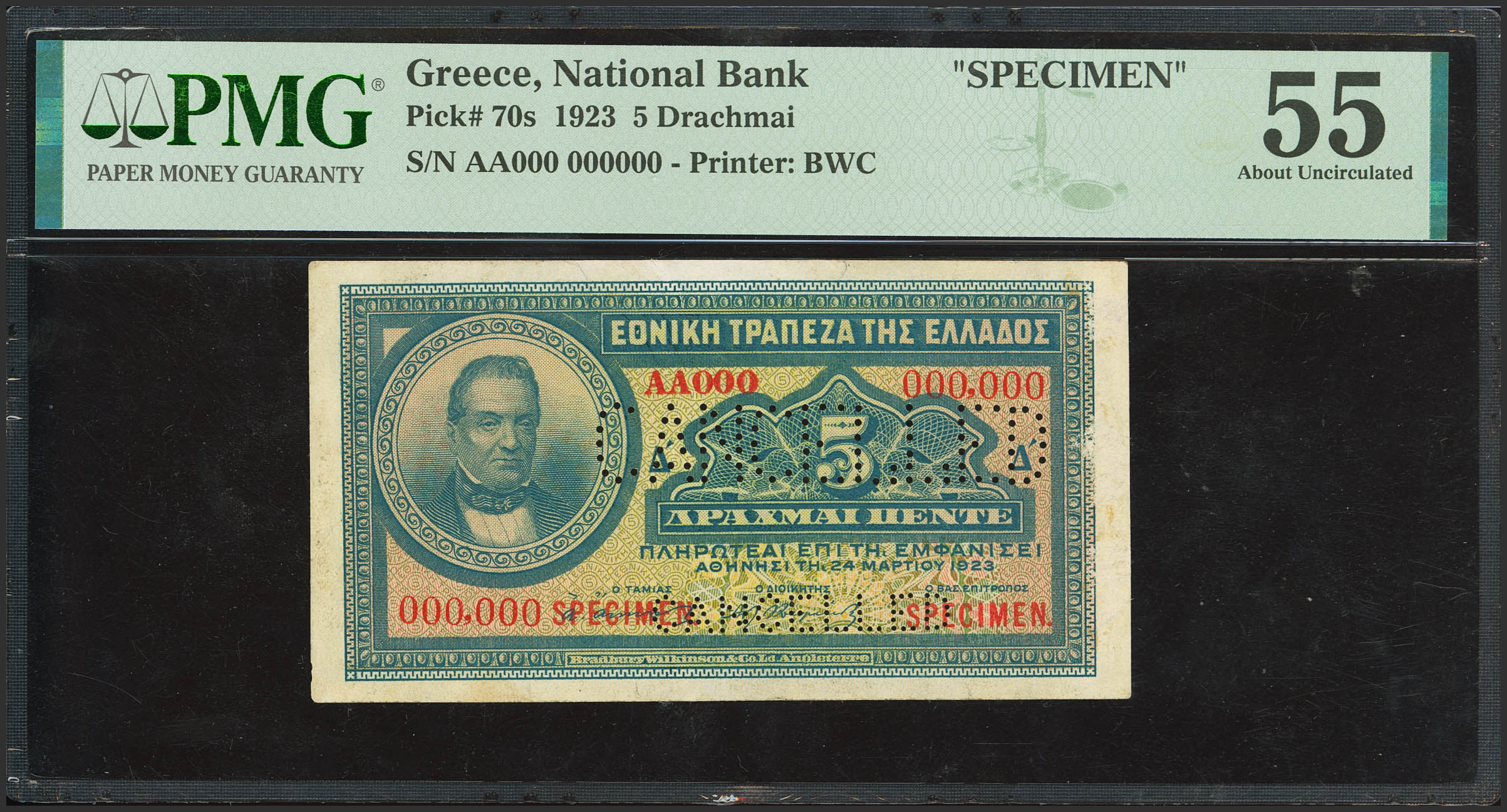 GREECE. 5 Drachmai. 1923. Specimen. (Pick: 70s). Rare. PMG55 (previously mounted).