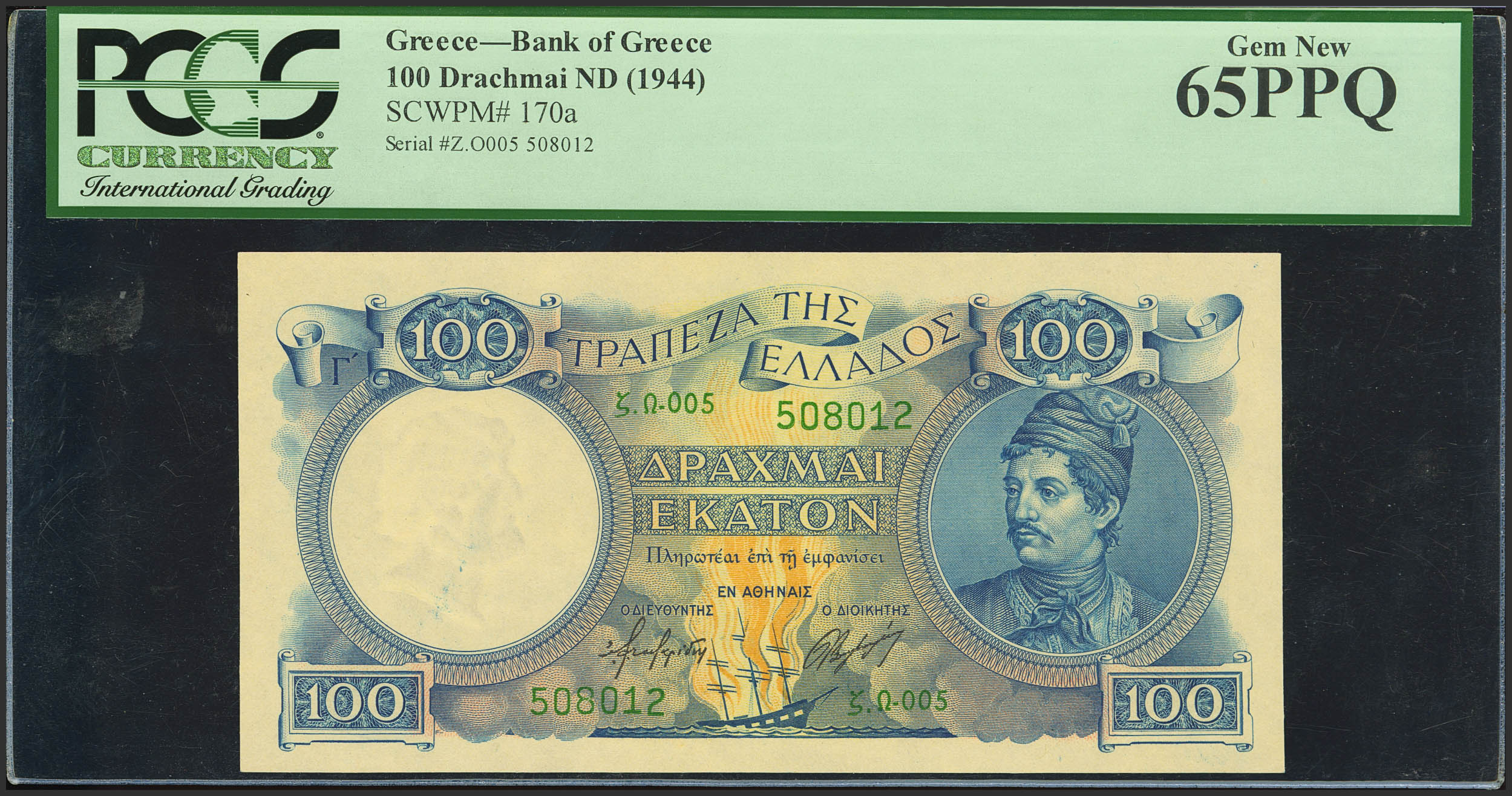 GREECE. 100 Drachmai. 1944. (Pick: 170a). Unusual in exceptional quality. PCGS65PPQ.